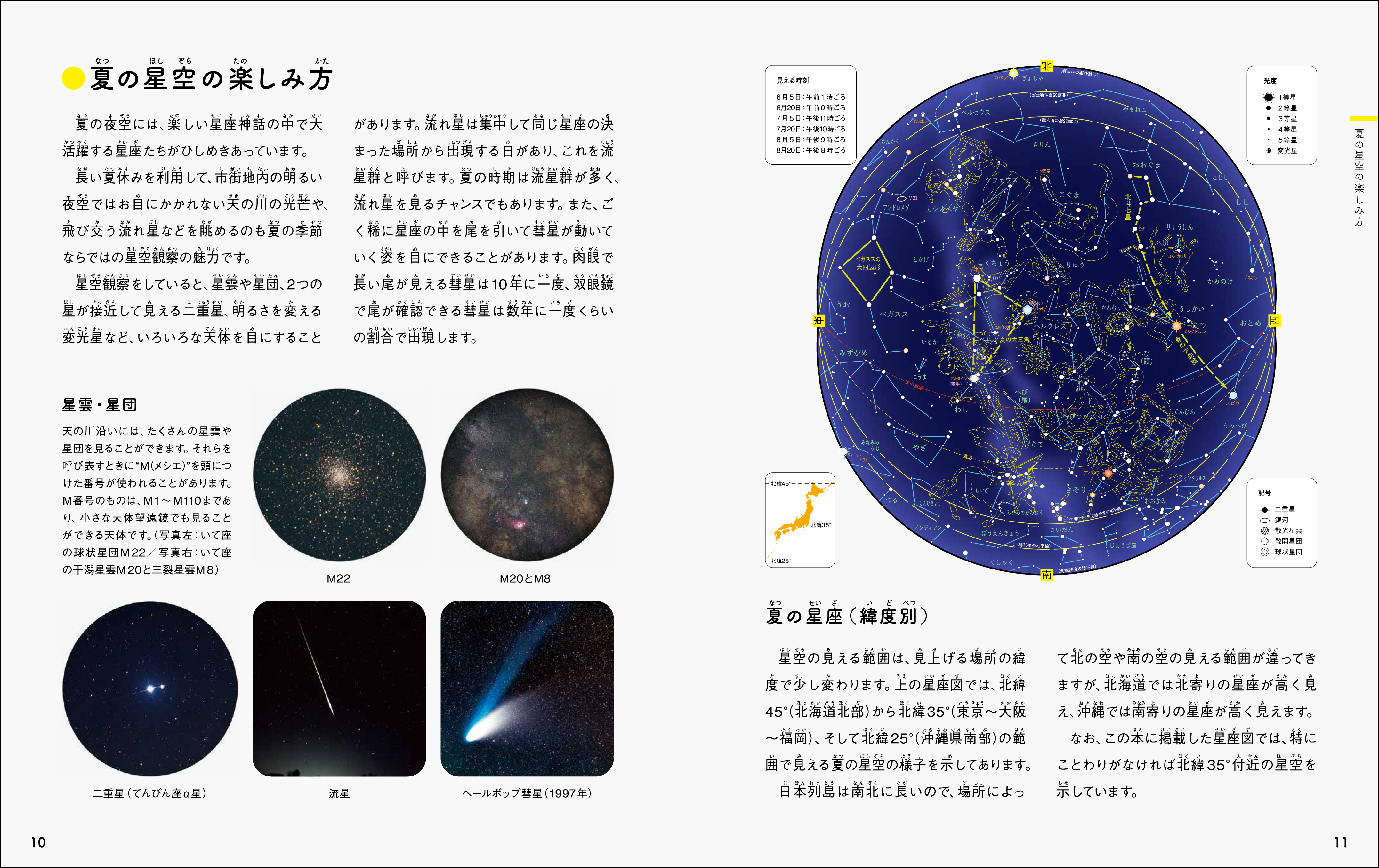 ●星座の見つけ方/星の明るさ/星座図とは/方位を確かめる/星のものさし/夏の星空の楽しみ方(夏の星座(緯度別))/夏の星座の見つけ方/北の空/南の空/夏の星空/夏は流星群の季節