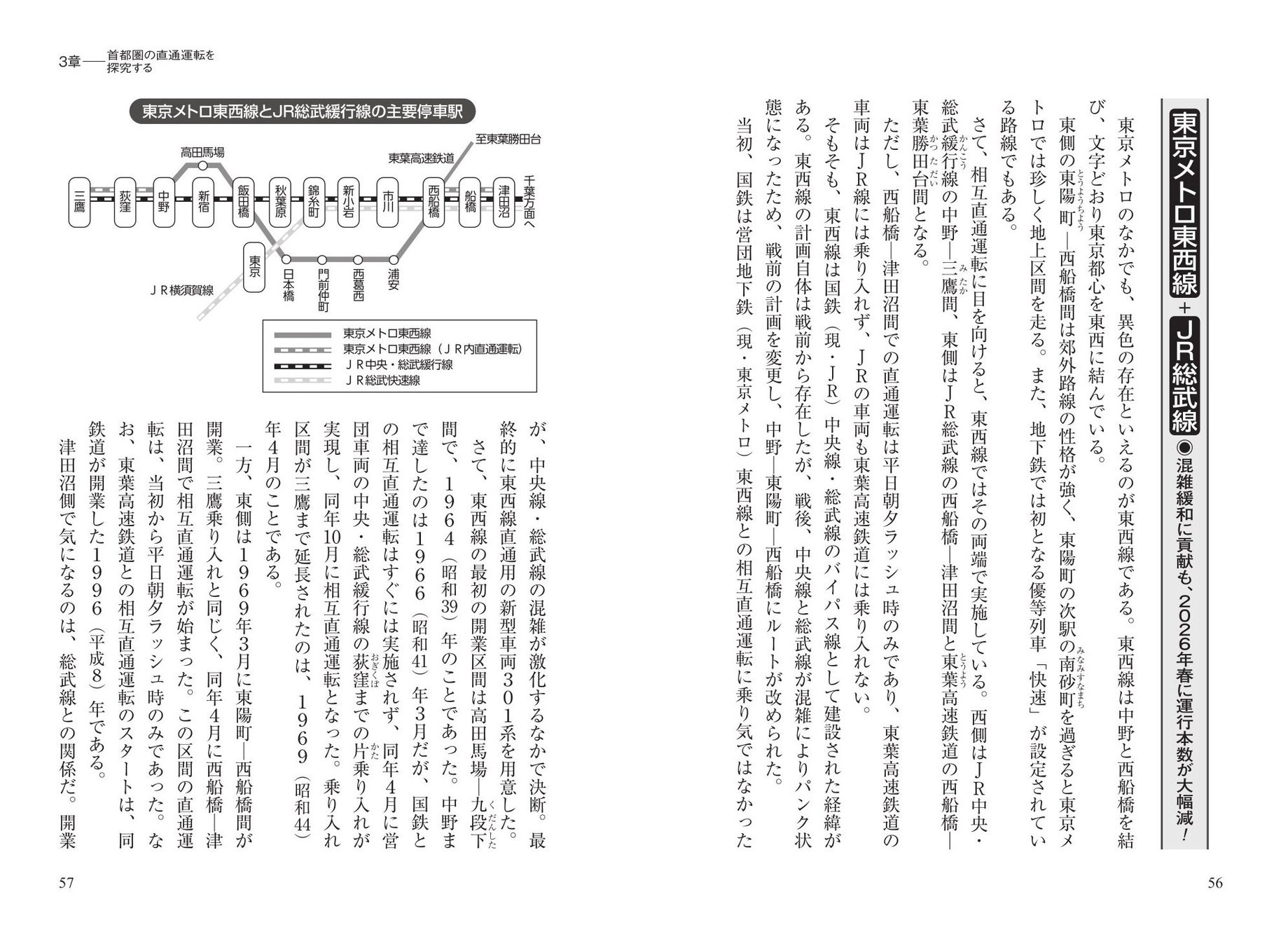 【東京メトロ東西線+JR総武線】混雑緩和に貢献も、2026年春に運行本数が大幅減!/【小田急電鉄+東京メトロ千代田線】地下鉄線内を青いロマンスカーが走る!/【東京メトロ千代田線+JR常磐線】ややこしい運賃体系になった理由とは?/【東急電鉄+東京メトロ/都営地下鉄】新横浜線開業で都心アクセスの新たな選択肢に/【京急電鉄+都営地下鉄+京成電鉄】2大空港直結!総距離は130キロ超え!/【京急本線+都営浅草線】地味な境界駅「泉岳寺」が再開発で変貌する!/【京急電鉄+都営地下鉄+京成電鉄】停車駅に注意が必要な「空港間直通列車」/【成田スカイアクセス線+都営地下鉄浅草線】新型有料特急の浅草線乗り入れもある?/【成田スカイアクセス線+北総鉄道】乗り入れているようで、じつは乗り入れていないって?/【北総開発鉄道+新京成電鉄】新ルートの整備により、13年で廃止された直通運転/【芝山鉄道+京成電鉄】芝山の車両が乗り入れ先以外の路線も走る理由は?/【京王新線+都営地下鉄新宿線】迷う人が続出!「新宿駅」はなぜ2つできた?/【東急東横線+東京メトロ日比谷線】50年続いた相互直通運転を、なぜ取りやめた?/【東急東横線+東京メトロ日比谷線】相互直通運転の廃止後も、不便を感じないわけ/【東京メトロ銀座線+東急田園都市線】幻に終わった直通計画とは?/【りんかい線+JR埼京線】埼玉・東京と湾岸エリアが直結!/【西武有楽町線】わずか2・6キロの路線が「有楽町線」を名乗るわけ/【西武秩父線+秩父鉄道秩父本線】かつての隆盛から一転、かろうじて残る直通運転/とにかくややこしい東京の直通運転。手軽な覚え方は?/東京初の直通運転は、鉄道ではなくバスだった