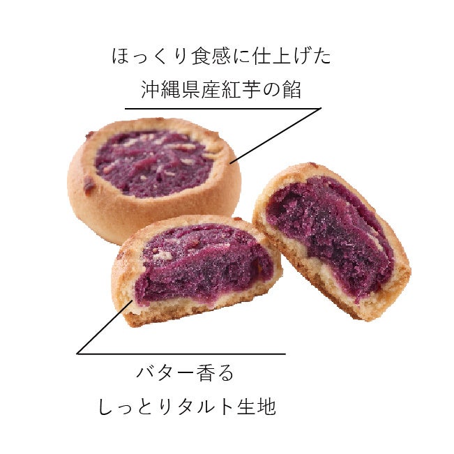 沖縄県産の紅芋をバター香るタルト生地に包み、しっとり焼き上げました。鮮やかな紅紫色でほっくりとした食感と濃厚な甘さの紅芋が詰まった、ひとくちサイズのタルトです。