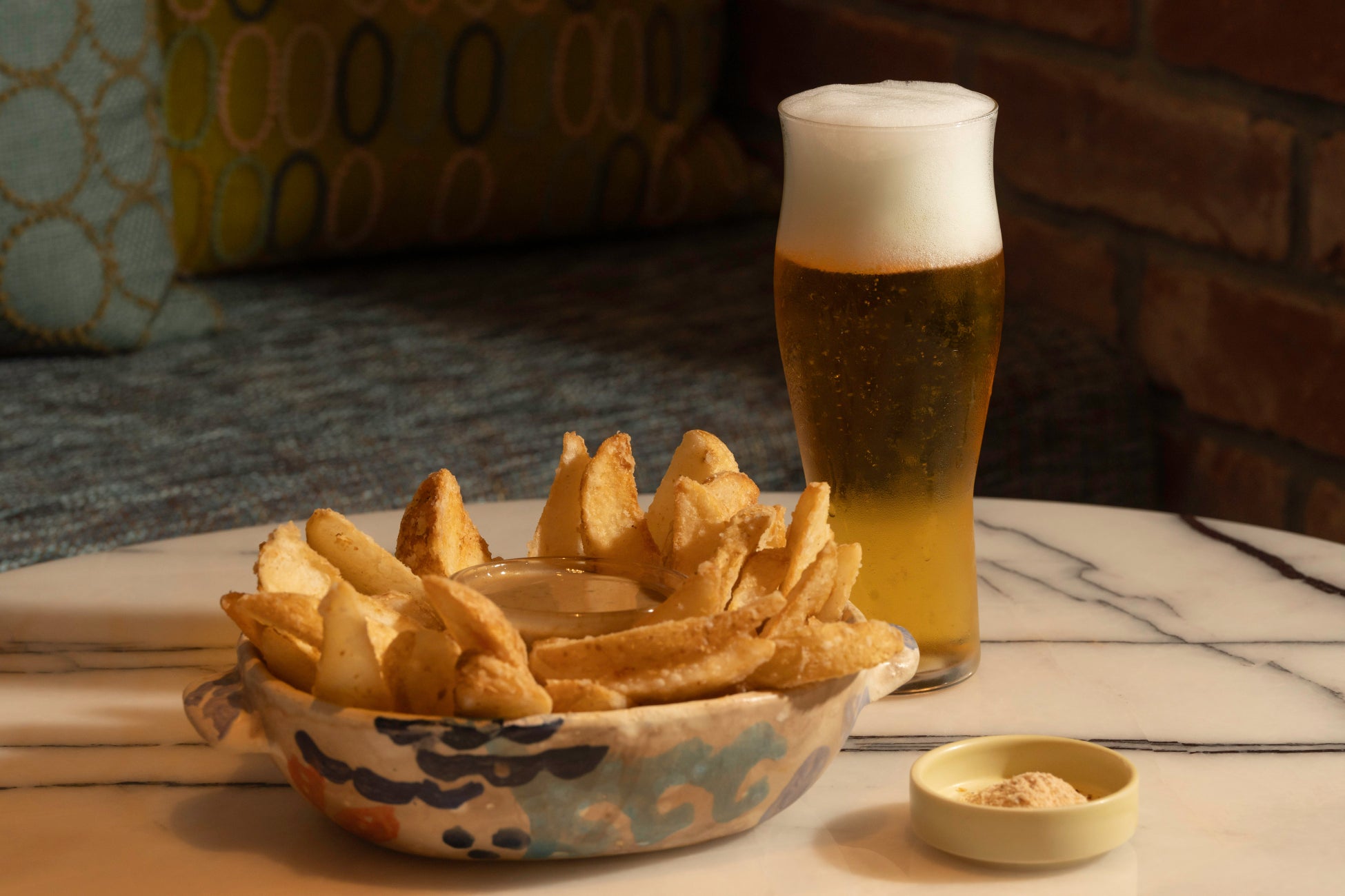 ホテルと街がシームレスに繋がる仕掛けが詰まったパブリックスペース「OMOベース」。ここでは、アフター夜景にまどろむ「海灯りの湯上がりラウンジ」と題して、訪れた人が素敵な夜時間を過ごせるイベントを開催しています。ご近所にあるジャズ喫茶のマスター厳選のジャズレコードが流れ、漁火をイメージしてライトアップした心地よい空間で、ビールとともに楽しめるのがイカゴロディップポテトです。これは、イカ風味の塩をまぶしたフライドポテトを、特製のコンディメントにディップして食べるメニューです。コンディメントには、スルメイカのゴロ(*2)使った「イカ味噌」にマヨネーズと醤油、「イカぶし(*3)」を合わせました。イカの風味を丸ごと楽しめる味わいなので、ついついビールが進みます。さらに、2025年2月からは、屋内スペースにイカをモチーフにした装飾も飾られ、イカの動きのように揺らめく様子を眺めながらまどろむ時間を過ごせます。
