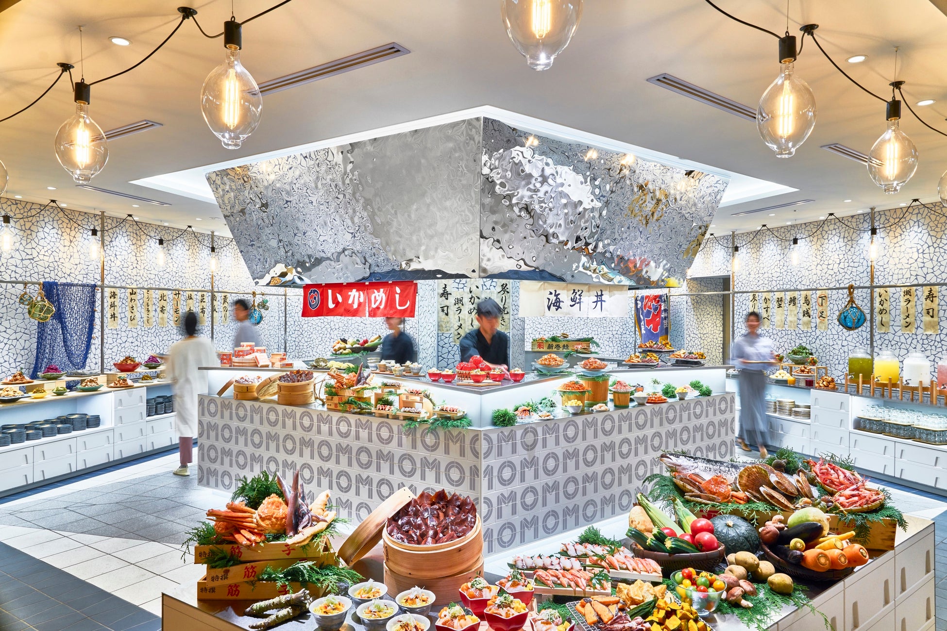 朝食ビュッフェに、イカを使った料理が14品並びます。イカをさまざまなスタイルで楽しめるよう、焼いたり蒸したりと調理方法を変え、和食、洋食、中華の料理を提供します。例えば、小さくて食べやすいイカを甘辛いタレで焼いた「小イカのぽっぽ焼き」は、イカのゴロも外さずに焼くので、ほろ苦い味わいがクセになる一品です。「イカの彩りマリネ」は、鮮やかな野菜とイカにハーブやビネガー、オイルを合わせ、さっぱりとした味に仕上げました。また、五稜郭をイメージした星形のライブキッチンで提供する「海鮮ファイブスターズ」でもイカを味わえます。薬味を混ぜ込み風味付けした酢飯に、イカやホタテなどを合わせた海宝漬やお刺身をたっぷりのせて作る「海鮮丼」や、イカゲソや野菜を香ばしく焼き上げた「炙り焼き」、イカの具材をトッピングして昆布、貝、蟹を贅沢に使用した出汁を使用したスープが特徴の「潮(しお)ラーメン」、そして、阿部商店の元祖「いかめし」を提供します。函館の海をイメージして烏賊墨染のアートボードや漁網の照明などを設えた、明るく開放的な空間で食べるイカづくしの朝食ビュッフェは、朝のテンションを上げること間違いありません。