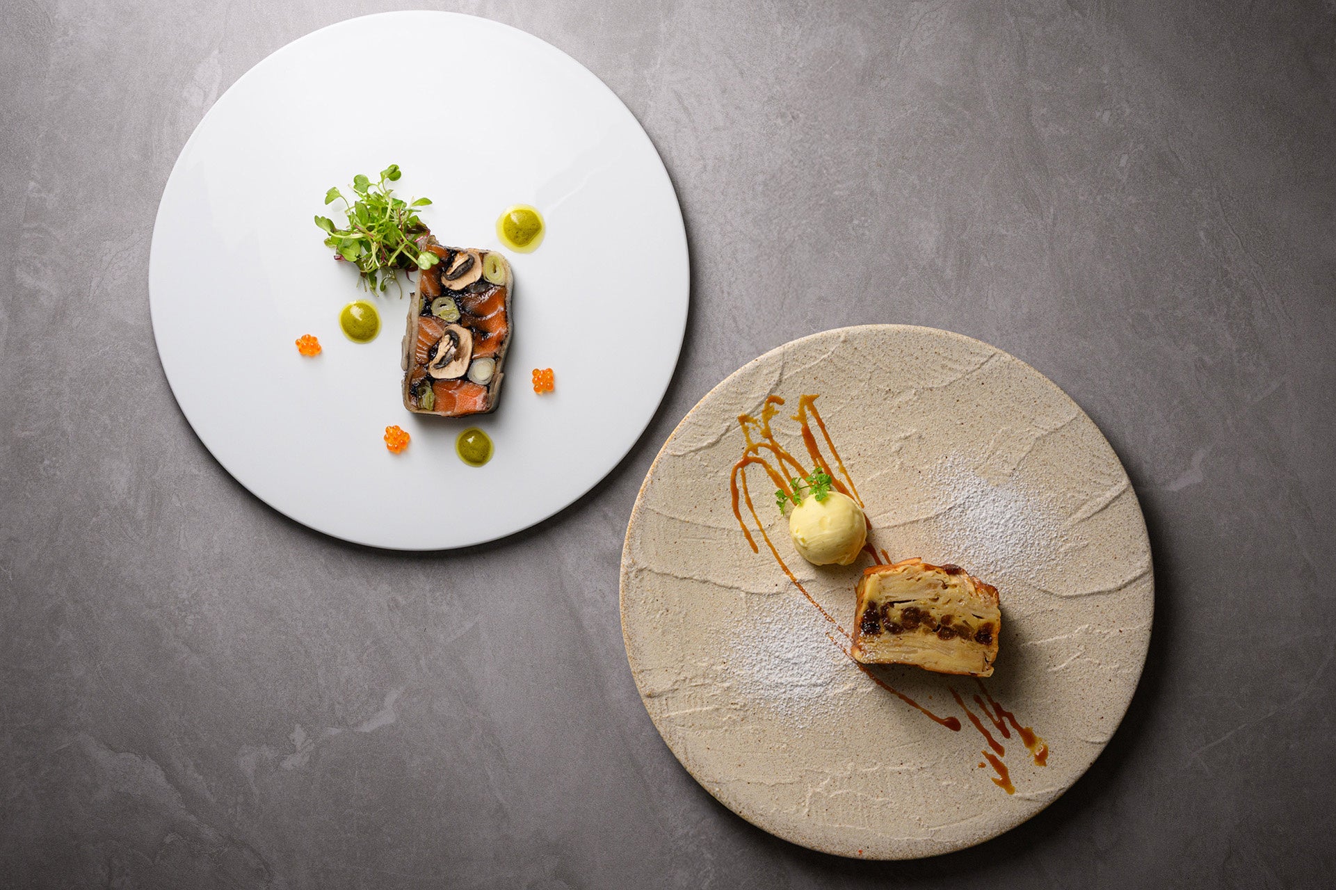 シグネチャーディッシュのテリーヌは、トラウトサーモンに甘みのある長ネギを合わせ、海苔で包み込んだ一品。しっとりとした口当たりの中に、磯の香りが広がる上品な味わいです。メインディッシュの一つ「山陰沖エテガレイのムニエル 根セロリソース」は、脂がのって身が厚く淡白ながらも旨味が深いのが特徴の山陰沖産のエテガレイの干物をムニエルに仕立て、コクのある根セロリのソースと合わせました。締めくくりのデザートは、切った断面に現れる美しい層が印象的なリンゴのガトーインビジブルや、甘く深みのあるアーモンドのような香りが特徴のトンカ豆のクレームブリュレなど最後のひと口までお楽しみいただけます。
