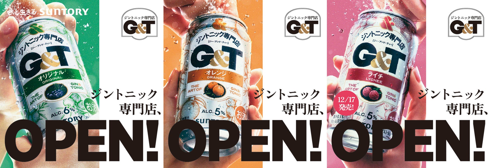 サントリー(株)は、「ジントニック専門店G&T(ジー・アンド・ティー)」を関東甲信越エリア※1で期間限定新発売します。第一弾として「ジントニック専門店G&T〈オリジナル〉」「同〈オレンジ〉」を11月19日(火)より、第二弾として「同〈ライチ〉」を12月17日(火)より発売します。