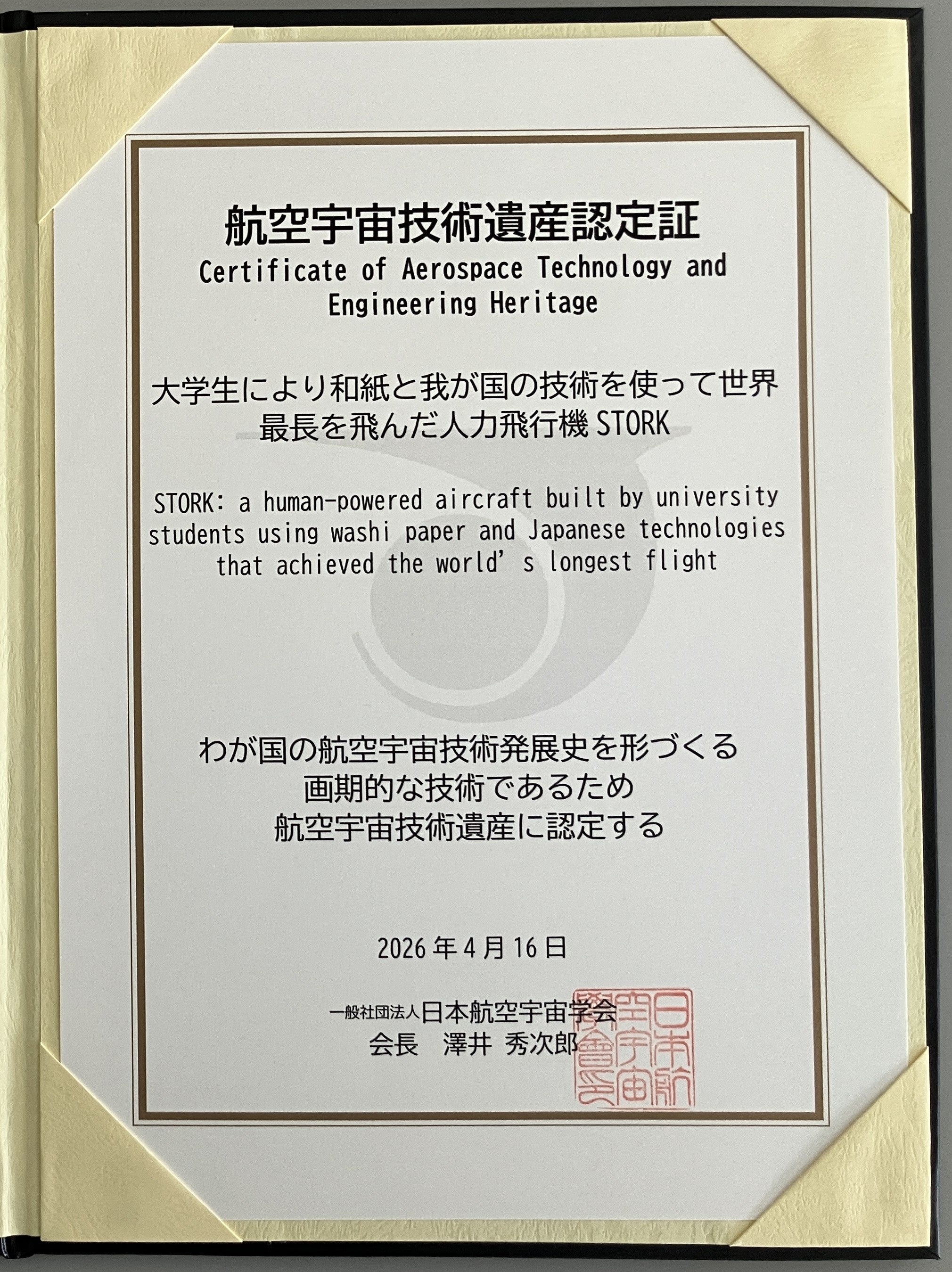 日本航空宇宙学会からは、和紙など日本独自のものづくり技術を生かした機体を全て学生チームで設計製作、飛行して世界記録を樹立し、人間の力だけで飛行できることを世界に広く認知させたこと、またその結果、多くの人が記録更新を目指して人力飛行機を設計・製作するようになり、航空技術者の育成にも寄与したこと等が高く評価されました。