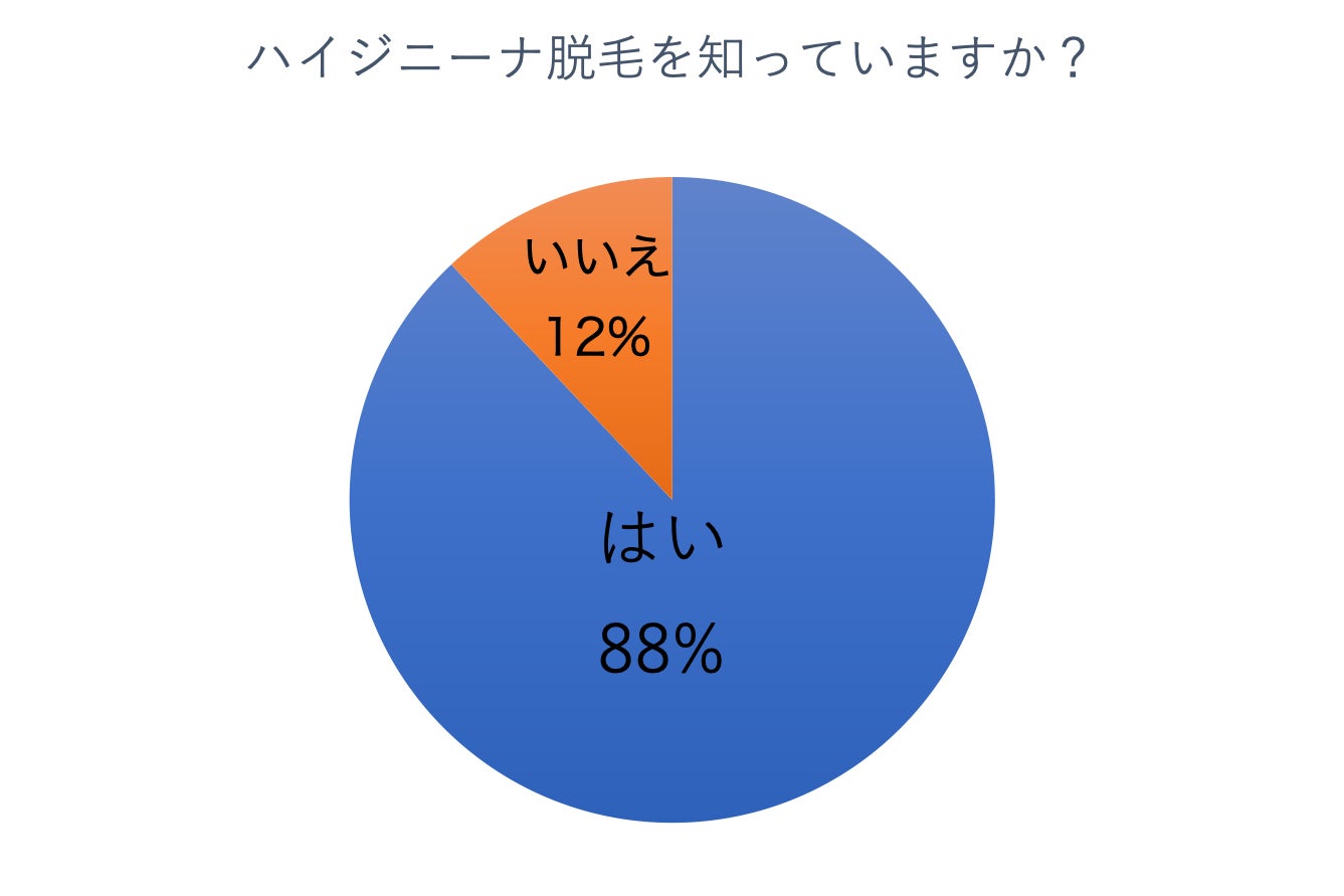 という結果になりました。VIO脱毛経験者の皆様は「ハイジニーナ」という言葉を知っている方が非常に多くいらっしゃいました。経験者には9割近く認知されているという結果となりました。