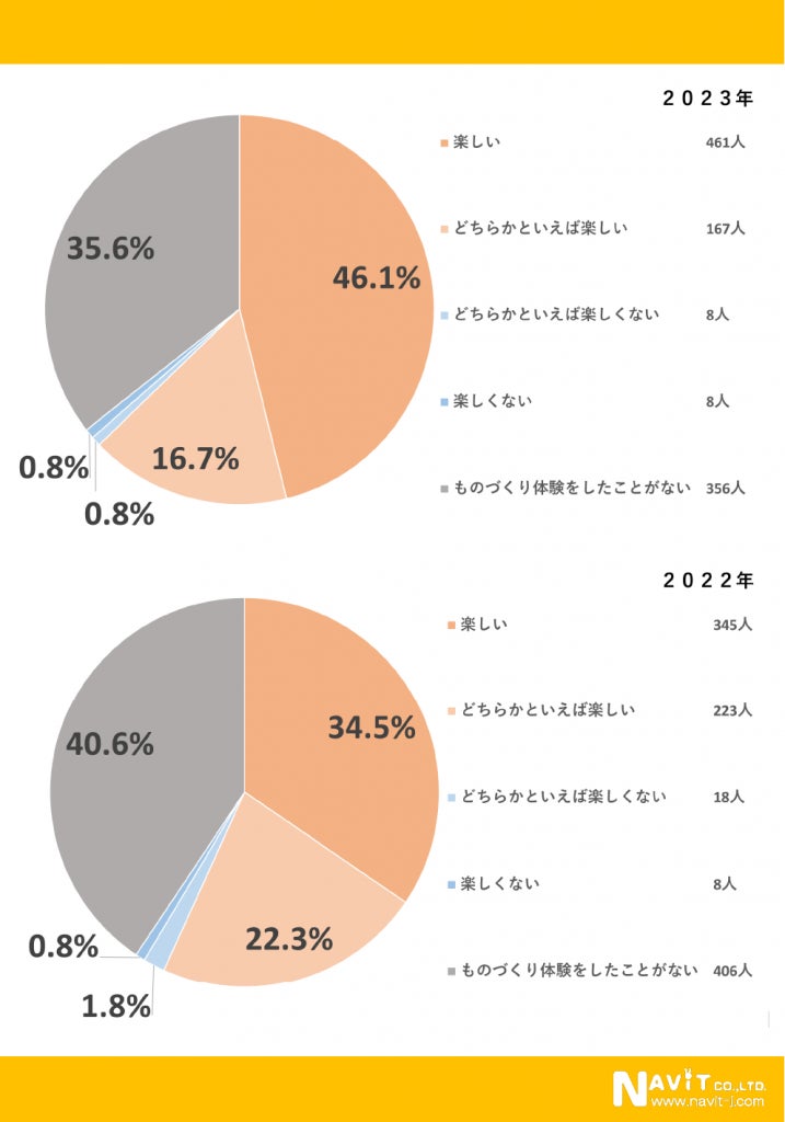 ものづくり体験は楽しかったですか?という質問に対して、「楽しい」と回答した方は全体の46.1%でした。34.5%(2022年度版)よりも11.6%増加しています。「どちらかといえば楽しい」と回答した方は16.7%で、22.3%(2022年度版)よりも減少していますが、「楽しい」「どちらかといえば楽しい」を合わせると、62.8%で、2022年度版の56.8%と比べると、6.0%増加しています。