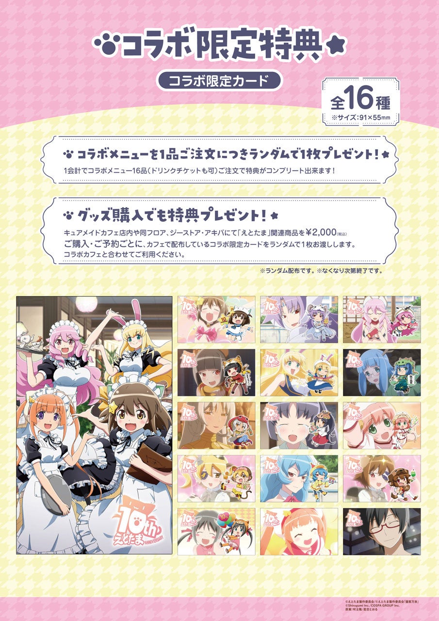 キュアメイドカフェ店内や同フロア、ジーストア・アキバにて「えとたま」関連商品を2,000円(税込)ご購入・ご予約ごとに、カフェで配布しているコラボ限定カードをランダムで1枚お渡しします。