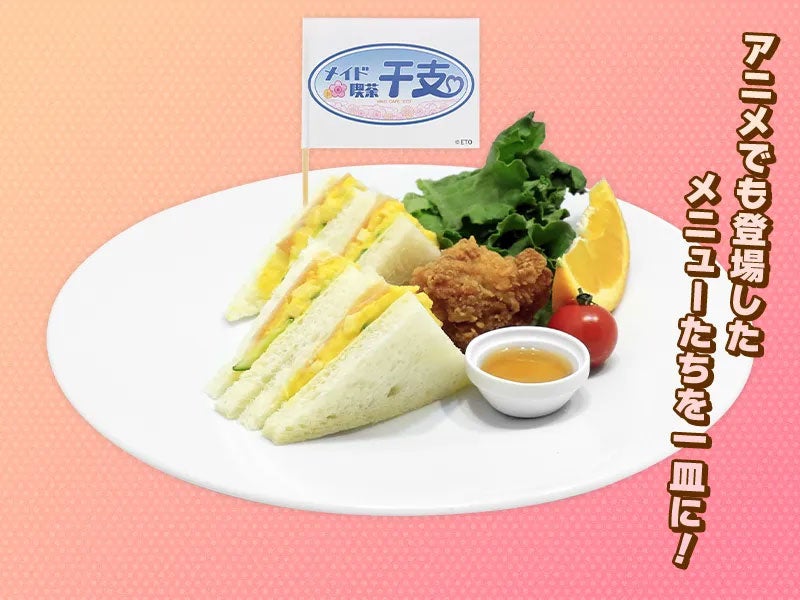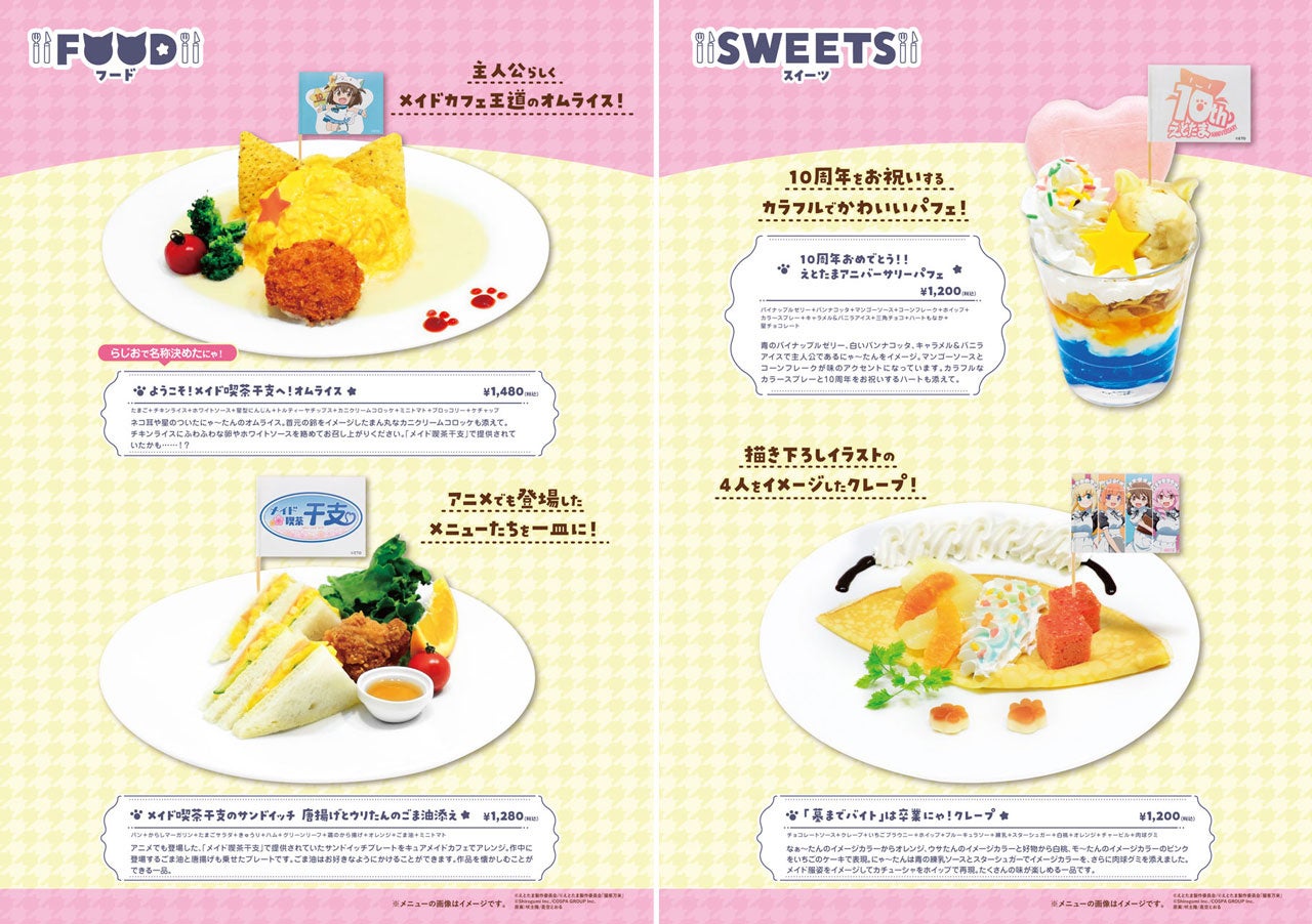 えとたまらじおでメニュー名をきめたコラボメニュー「ようこそ!メイド喫茶干支へ!オムライス」をはじめ、アニメでも登場した「メイド喫茶干支のサンドイッチ 唐揚げとウリたんのごま油添え」や「10周年おめでとう!! えとたまアニバーサリーパフェ」など、にゃ~たんや干支神たちをイメージしたメニューがずらり。