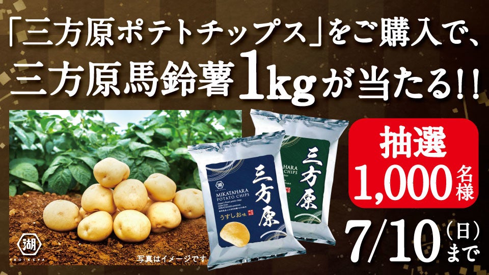 昨年ご好評いただいたキャンペーンを今年も実施します!静岡が誇る希少な“三方原馬鈴薯”を、ポテトチップス以外の料理でもお召しあがりいただき、そのおいしさをより多くの方々に広めたいとの想いから、「三方原ポテトチップス」を購入した方の中から抽選で1,000名様に、“三方原馬鈴薯”1kgをプレゼントするキャンペーンを実施します。