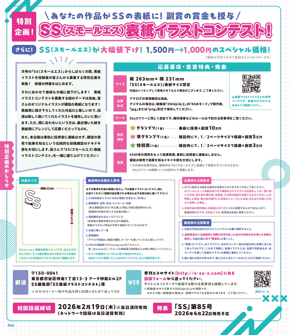 「SS(スモールエス)」85号(2026年4⽉21⽇発売予定) ※発売を持って結果発表とさせていただきます。 ※その他の応募作品も、優秀作品は「SS(スモールエス)」誌面にて発表させていただきます。 |