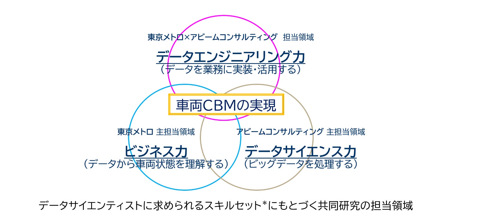 本共同研究は、鉄道車両の状態基準保全(CBM)の実現を目指し、車両関連の状態データ分析手法 の研究と同分析手法を運用するためのシステム基盤構成を検討します。東京メトロ及びアビームコンサ ルティングが協力し、データに基づく新たな保全体系の構築に向けた技術と知見を獲得することで、安 全・安定輸送のさらなるレベルアップを図り、将来のエンジニア減少を見据えた保全業務の DX を推進 して参ります。