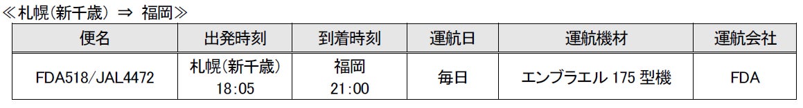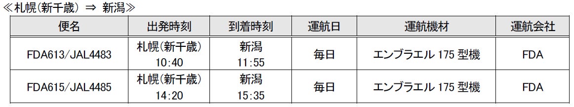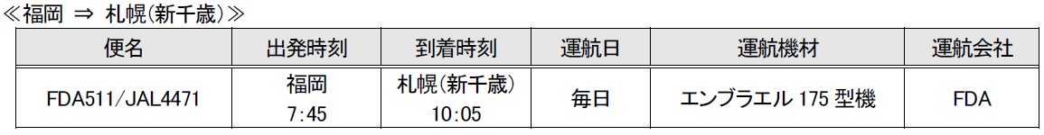 株式会社フジドリームエアラインズ(本社:静岡県静岡市、代表取締役社長:楠瀬 俊⼀、以下「FDA」)と日本航空株式会社(本社:東京都品川区、代表取締役社長:鳥取 三津子、以下「JAL」)は、2025年3月30日(日)よりFDAが新たに就航する福岡=札幌(新千歳)、札幌(新千歳)=新潟の両路線において、JALコードシェア便を設定します。