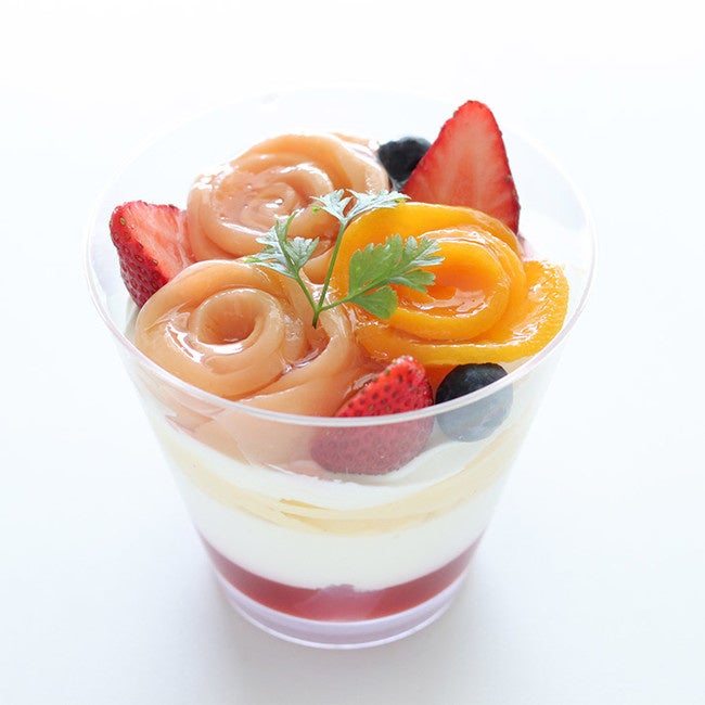 フルーツをバラのブーケのように飾りました。ベリーゼリーとミルクムースにナタデココの弾む食感が楽しめます。※数に限りがございます。売り切れの際はご容赦ください。