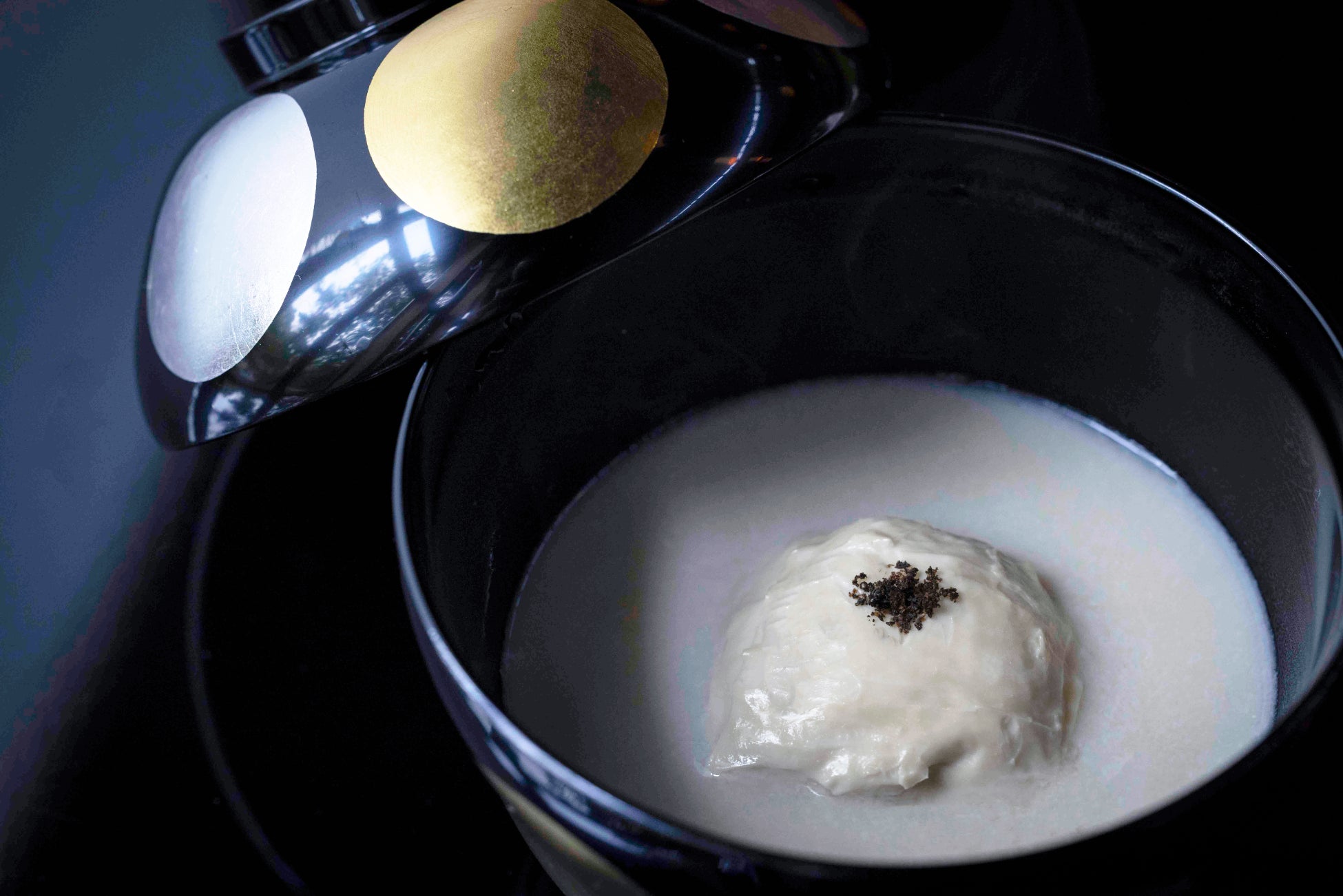 軽井沢に雪が積もった冬景色を表現した椀物です。真っ白な生湯葉が、水面を漂うように静かに椀に浮かび、その下には、ふっくらと蒸したクエの真丈が隠れています。口に含むと、クエの繊細な旨味がじんわりと広がります。吟醸酒の酒粕を使った芳醇な出汁が、体の芯から温めます。静寂の中に凛とした美しさが光る、冬ならではの特別な一椀です。