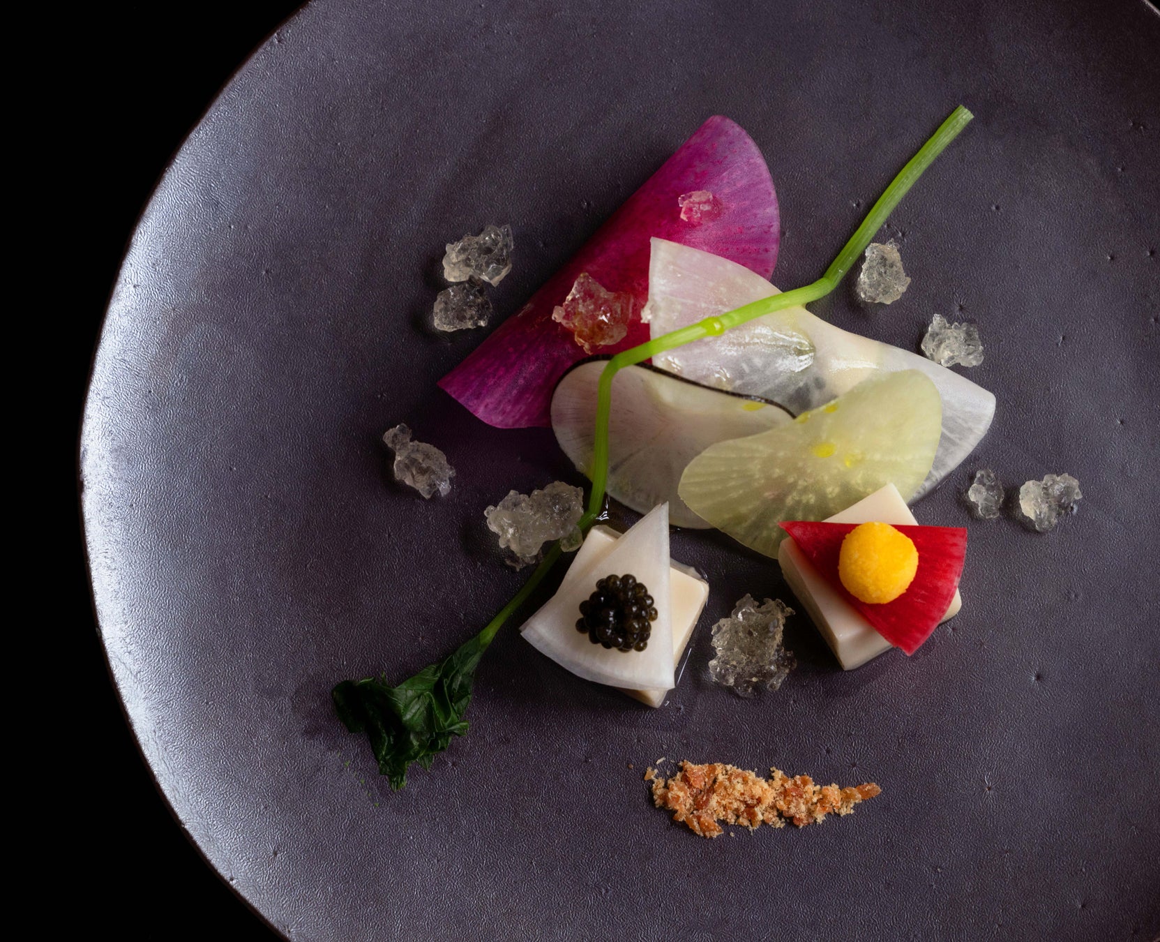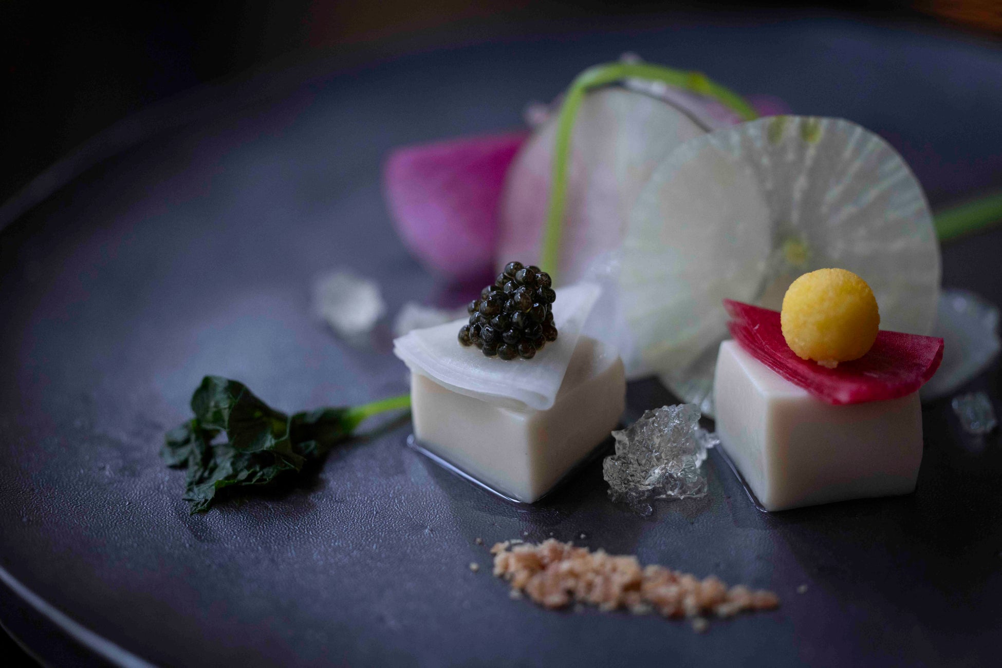 冬の到来を告げるふぐの白子を使った、滑らかな舌触りの白子豆腐に、緑、黒、紅の色鮮やかな三種の大根を合わせた先附です。緑大根の爽やかな辛味、黒大根のほのかな苦味、紅大根の優しい甘みが、ふぐの白子豆腐やキャビア、生唐墨などの食材と調和した複雑ながらも奥深い味わいです。