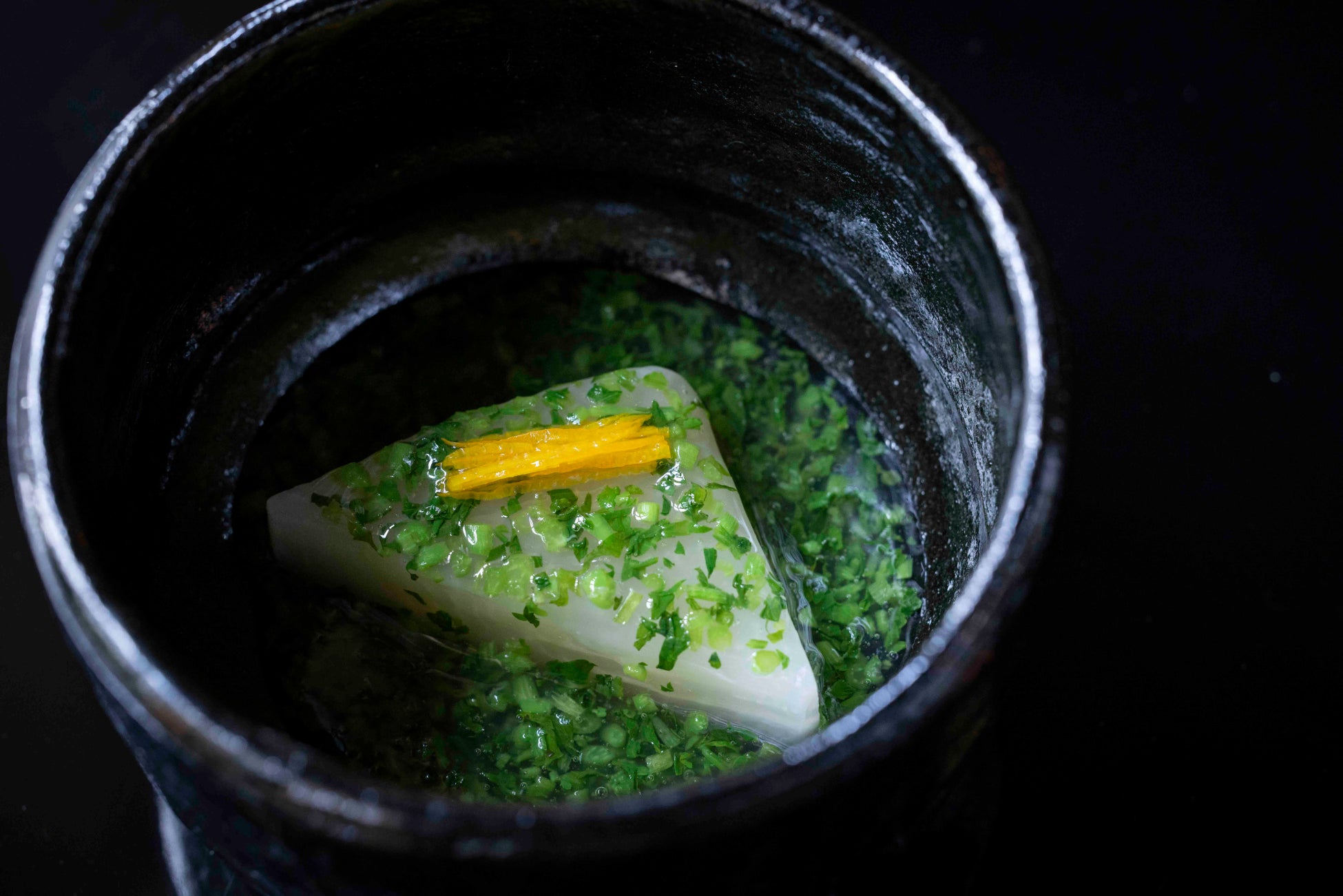 煮物は、 冬に旬を迎える大根を柔らかく炊き上げた一品です。鮮やかな緑色のクレソンと餡状に仕立てた風味豊かな出汁を掛けました。クレソンのほろ苦さと柚子の香りが、大根の甘みを引き立て滋味深い味わいを奏でます。体の芯から温まるような、優しい味わいの煮物です。