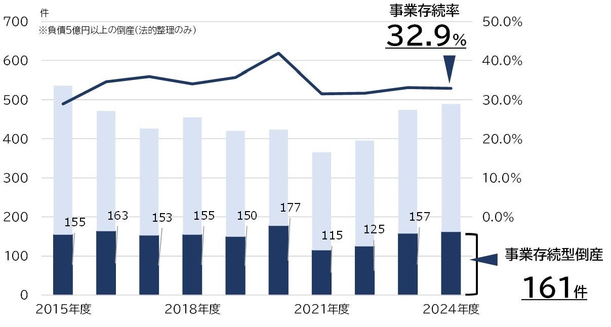 2024年度の事業存続型倒産(負債5億円以上)は、前年度を4件上回る161件判明し、3年連続の増加となった。一方で、全倒産(同)に占める事業存続型の割合(事業存続率)は32.9%と、前年度から0.2ポイントの微減。概ね3社に1社が事業を存続している状況に変わりはなかった。
