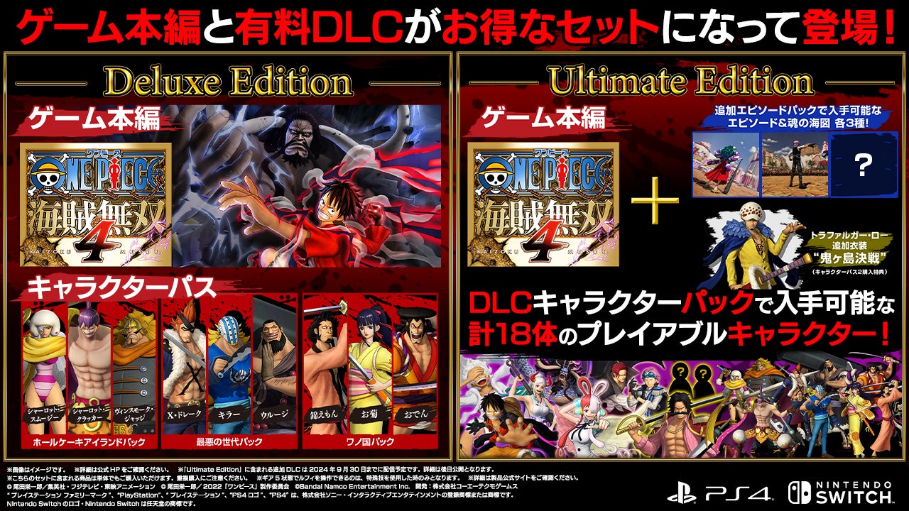 「ONE PIECE 海賊無双4」本編だけではなく、ゲーム本編とDLCがセットになった「Deluxe Edition」と「Ultimate Edition」がセール実施中!まだ遊んだことのない方も、是非この機会に「海賊無双4」の爽快なアクションや原作エピソードの追体験をお楽しみください。