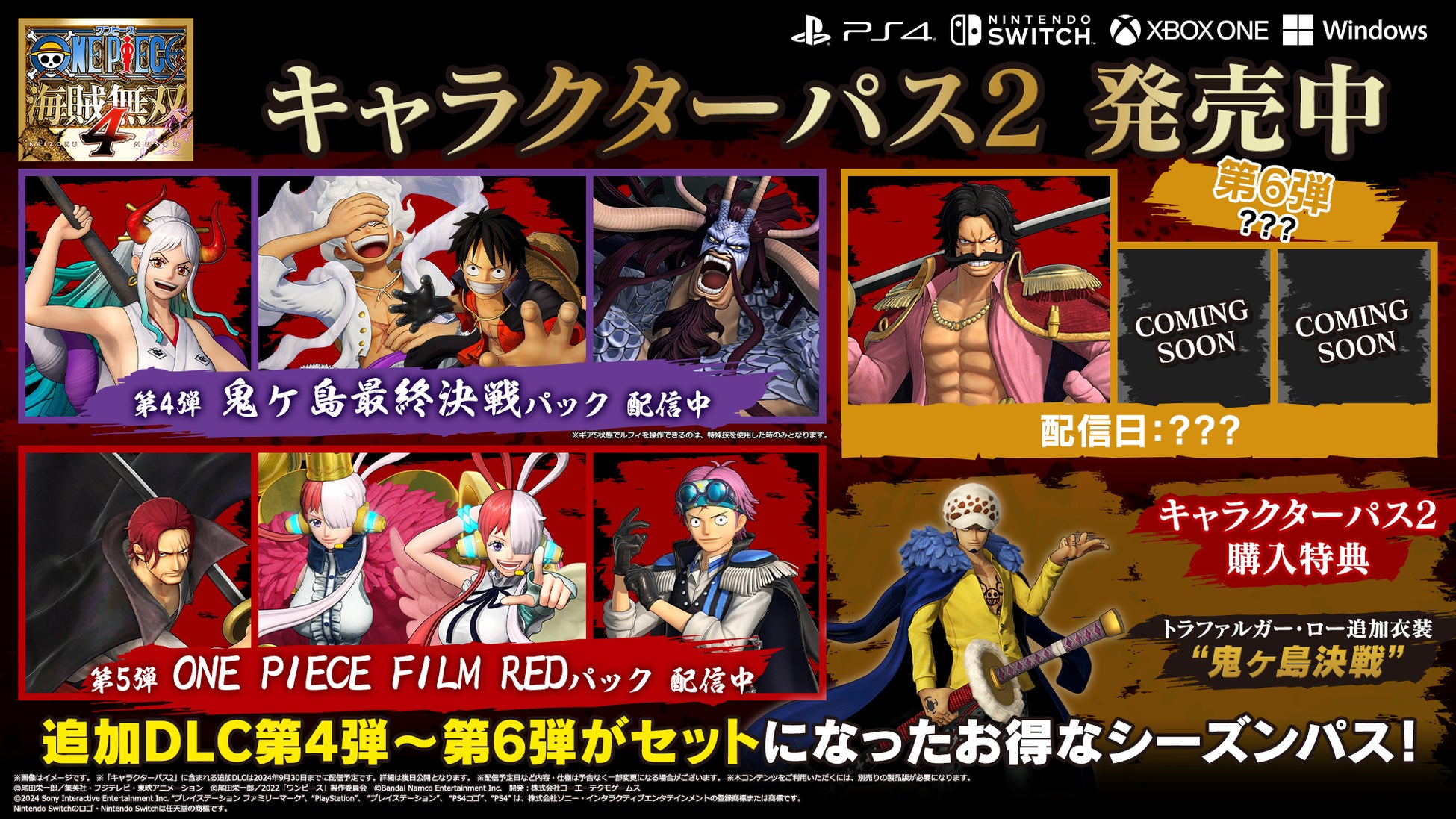 キャラクターパック第4弾~第6弾で配信されるプレイアブルキャラクター9人がセットになったお得な「キャラクターパス2」発売中!!第6弾で配信予定のキャラクターは近日公開予定!また、購入者特典としてトラファルガー・ローの追加衣装“鬼ヶ島決戦”が付属!