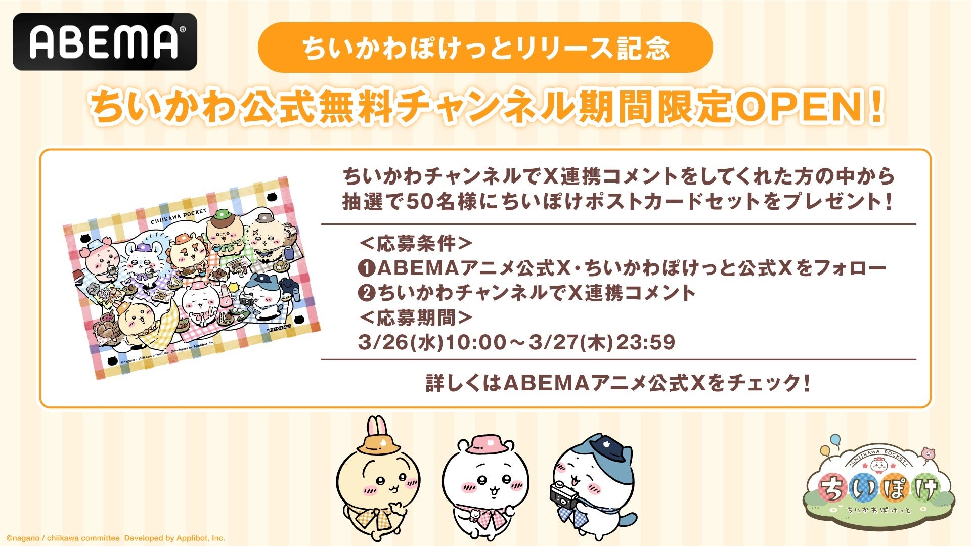 さらに、『ちいかわぽけっと』とのコラボキャンペーンも。『ちいかわぽけっと』公式X (@chiikawa_pt_jp)と、ABEMAアニメ公式X (@Anime_ABEMA)をフォローし、チャンネル開設から3月27日(水)夜11時59分までに、「ちいかわ公式無料チャンネル」を視聴し、X連携機能を使ってコメントを投稿いただいた方から抽選で50名様に「ちいぽけポストカードセット」をプレゼントいたします。
