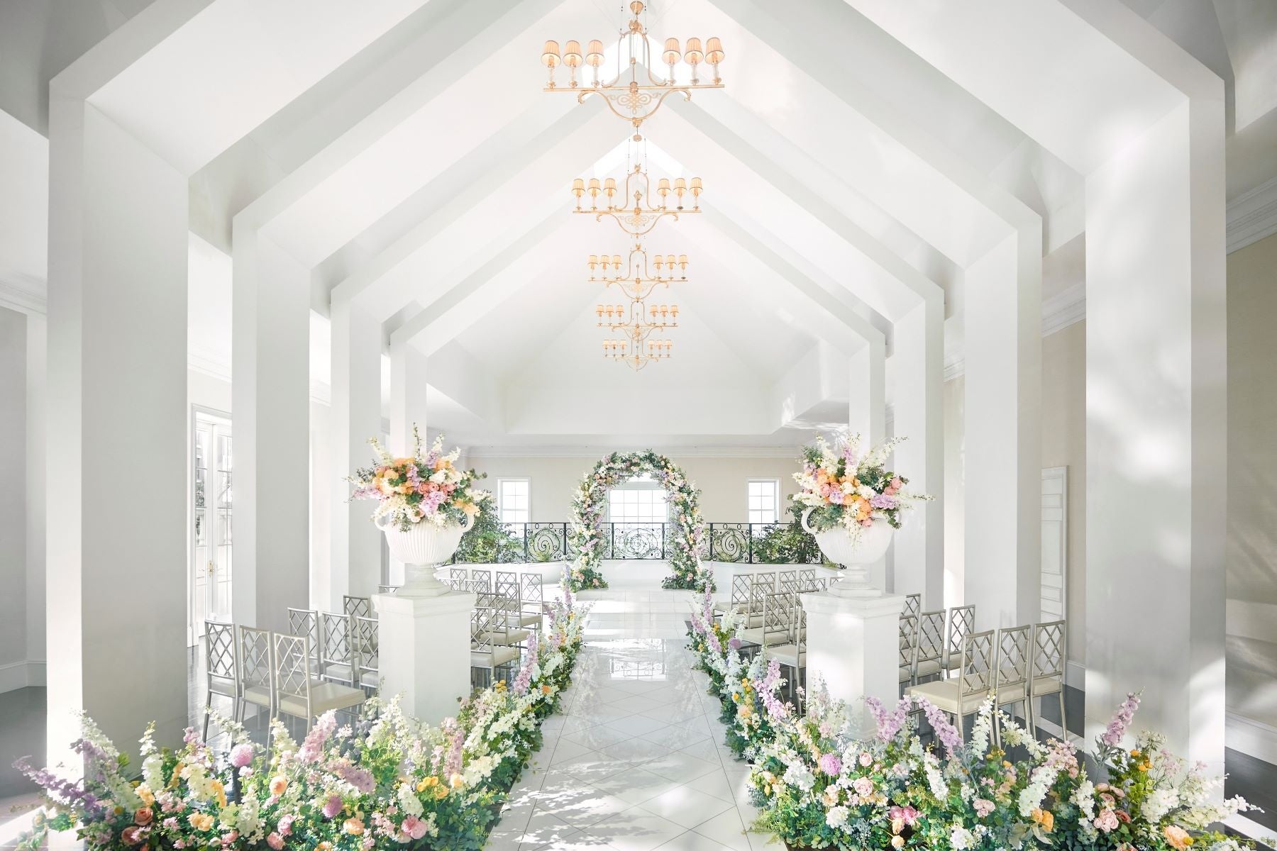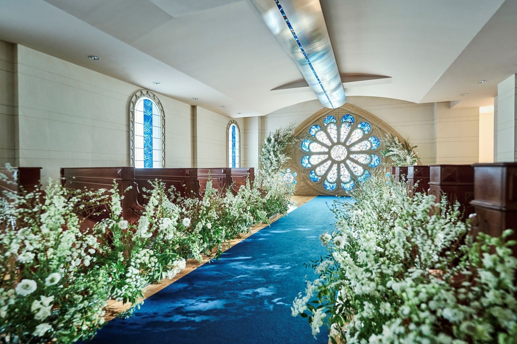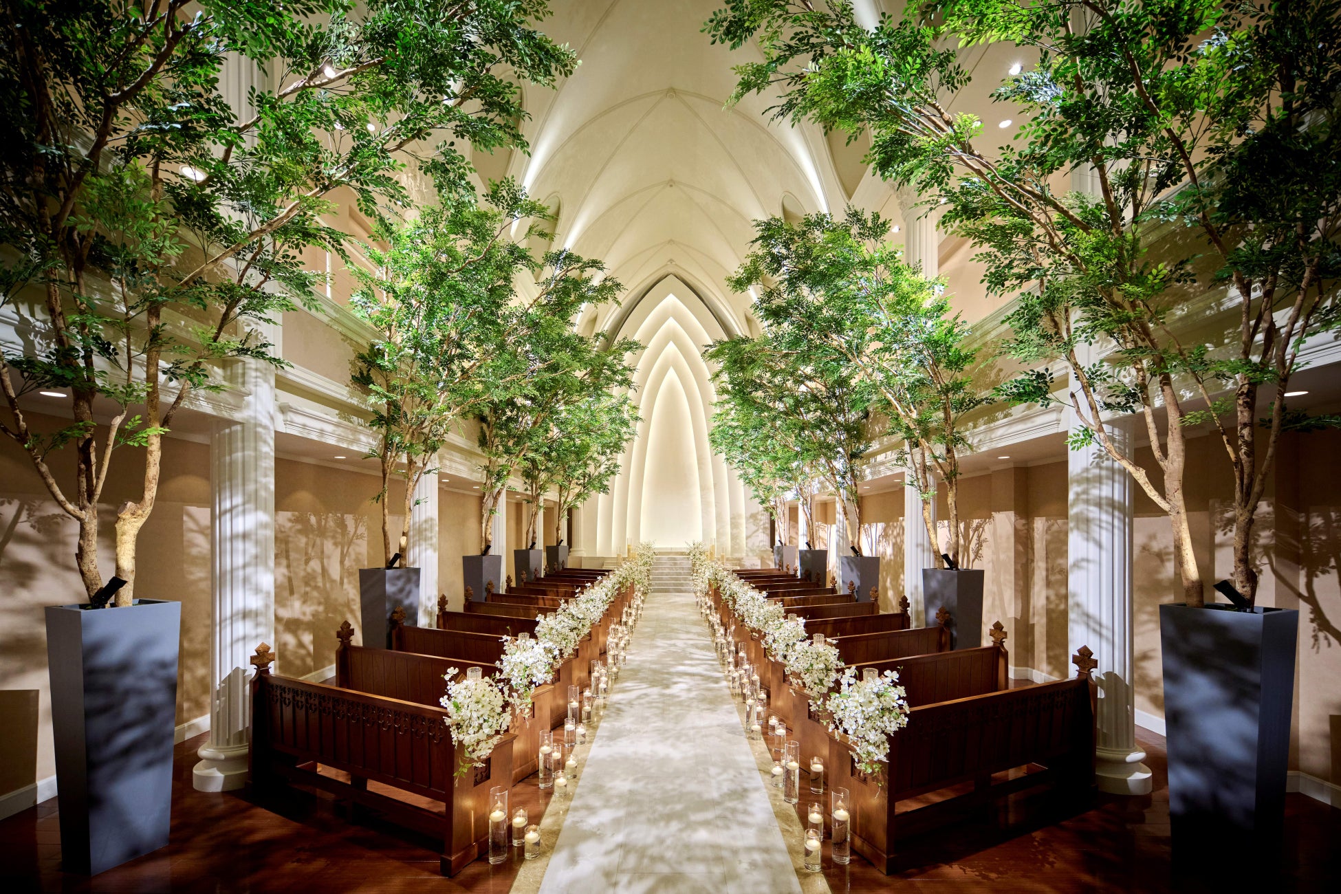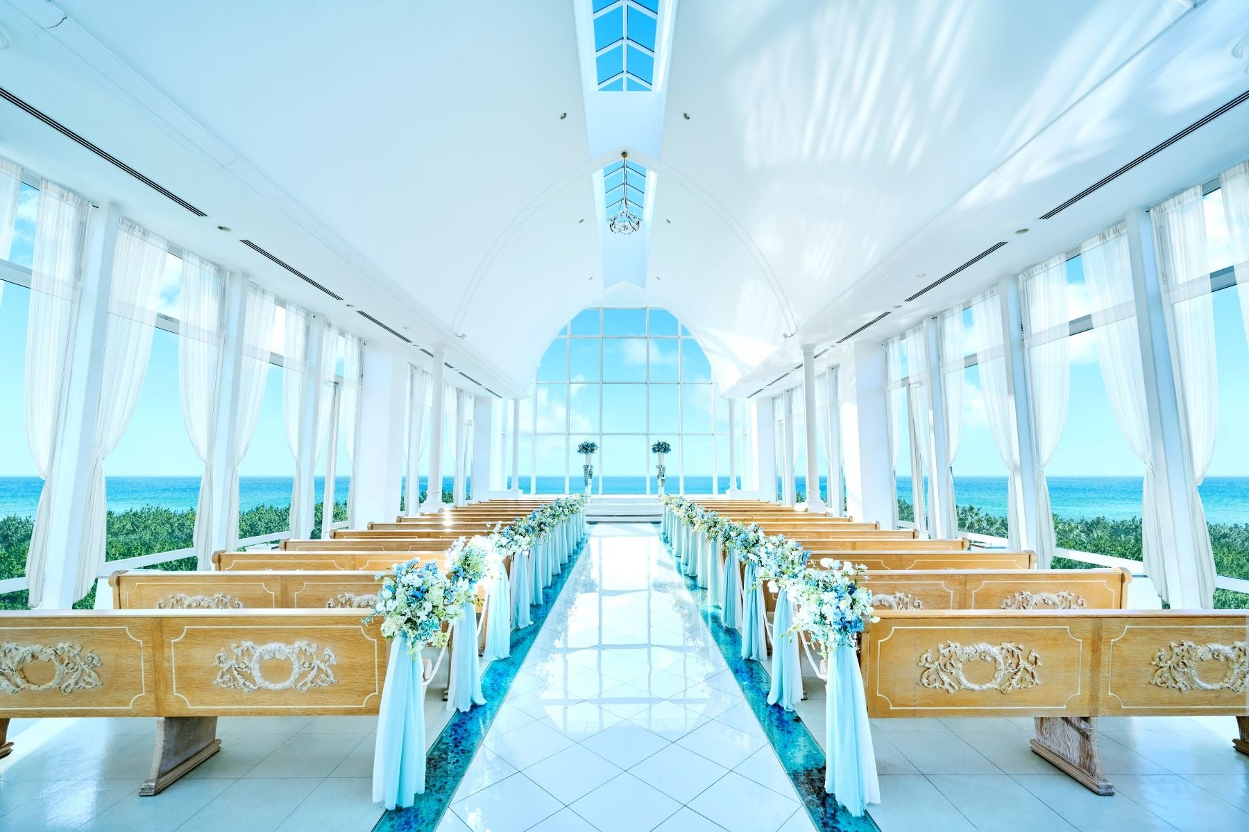 白を基調としたチャペルで高級感溢れる空間です。20メートルの大理石のバージンロードが