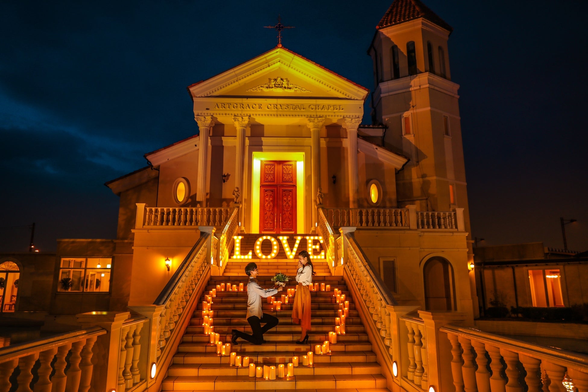 名古屋有数のシティホテルで叶える特別なプロポーズを。鉄板焼や夜景が美しいレストランでのディナーコースをお召し上がりいただいた後、ホテルのエントランスを入ると目の前にそびえる大聖堂を貸し切って、ドラマティックなプロポーズが叶います。