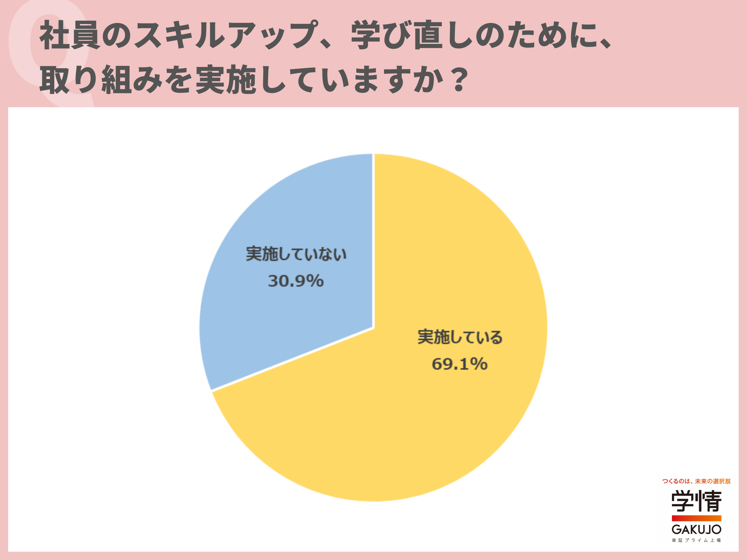 社員のスキルアップ、学び直しの取り組みについて、「実施している」と回答した企業が69.1%に上りました。約7割の企業が、社員のスキルアップや学び直しに関連する取り組みを実施していることが分かります。