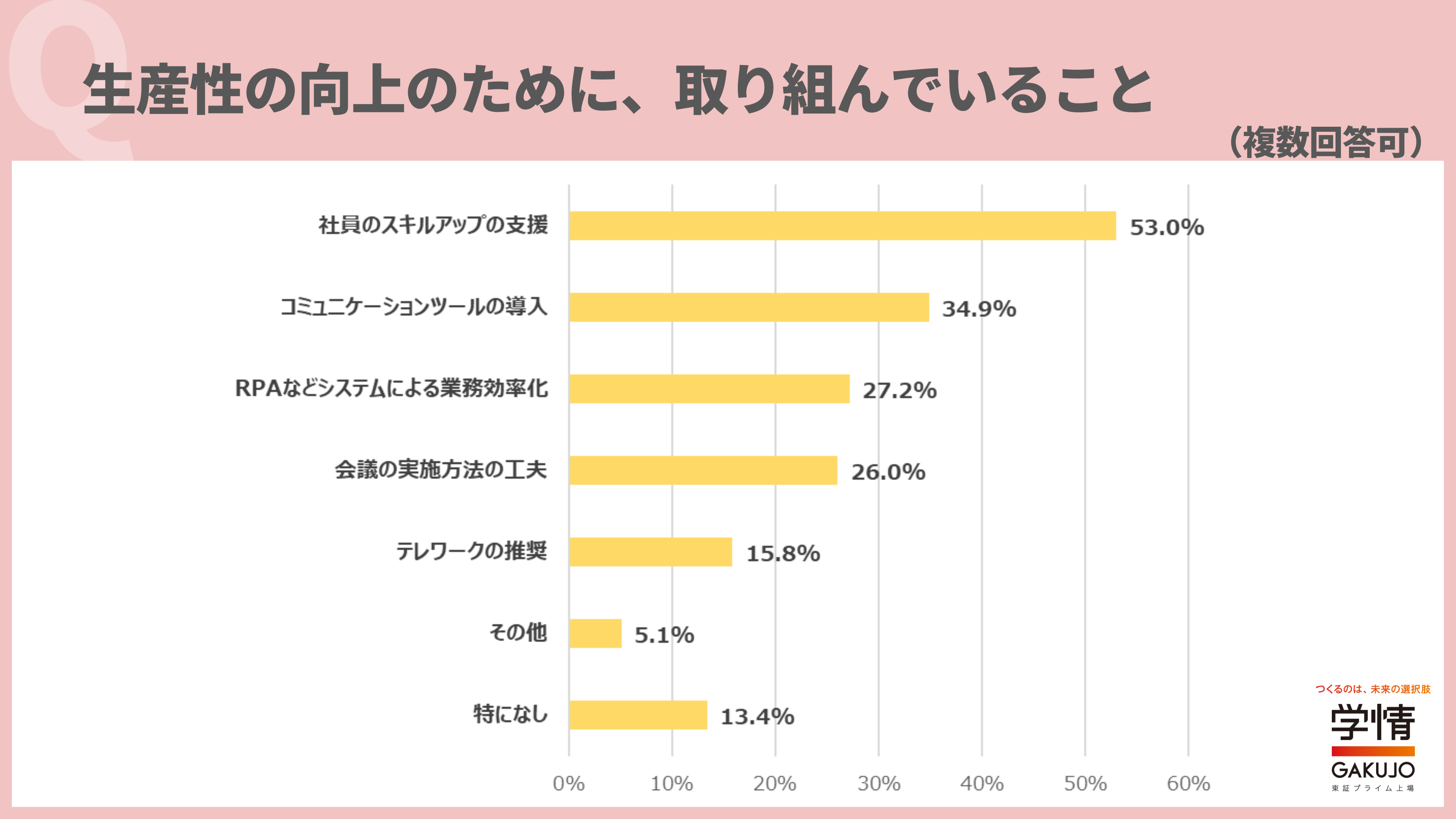 生産性の向上のために取り組んでいることは「社員のスキルアップの支援」が53.0%で最多。次いで、「コミュニケーションツールの導入」34.9%、「RPAなどシステムによる業務効率化」27.2%が続きました。