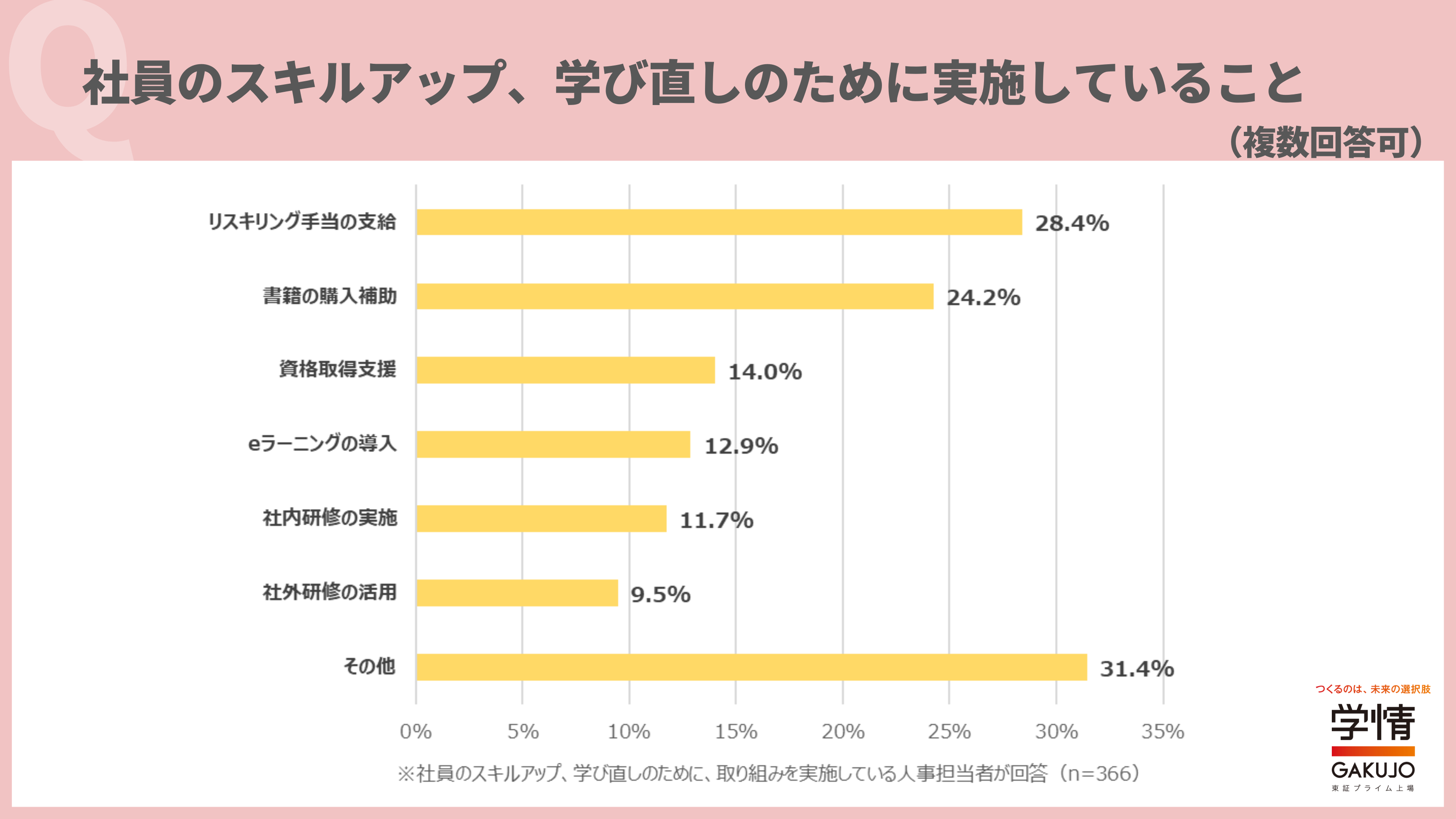 社員のスキルアップ、学び直しのために実施していることは、「リスキリング手当の支給」が28.4%で最多。次いで、「書籍の購入補助」24.2%、「資格取得支援」14.0%が続きました。「年間10万円までセミナー受講料や書籍購入を補助している」「会社が取得を奨励する資格は、資格試験の受験料を支給している」「就業時間内に必要な外部研修に参加することを認めている」「eラーニングを導入し、社員の関心や業務内容に応じて学べる環境を整備している」といった声が寄せられました。