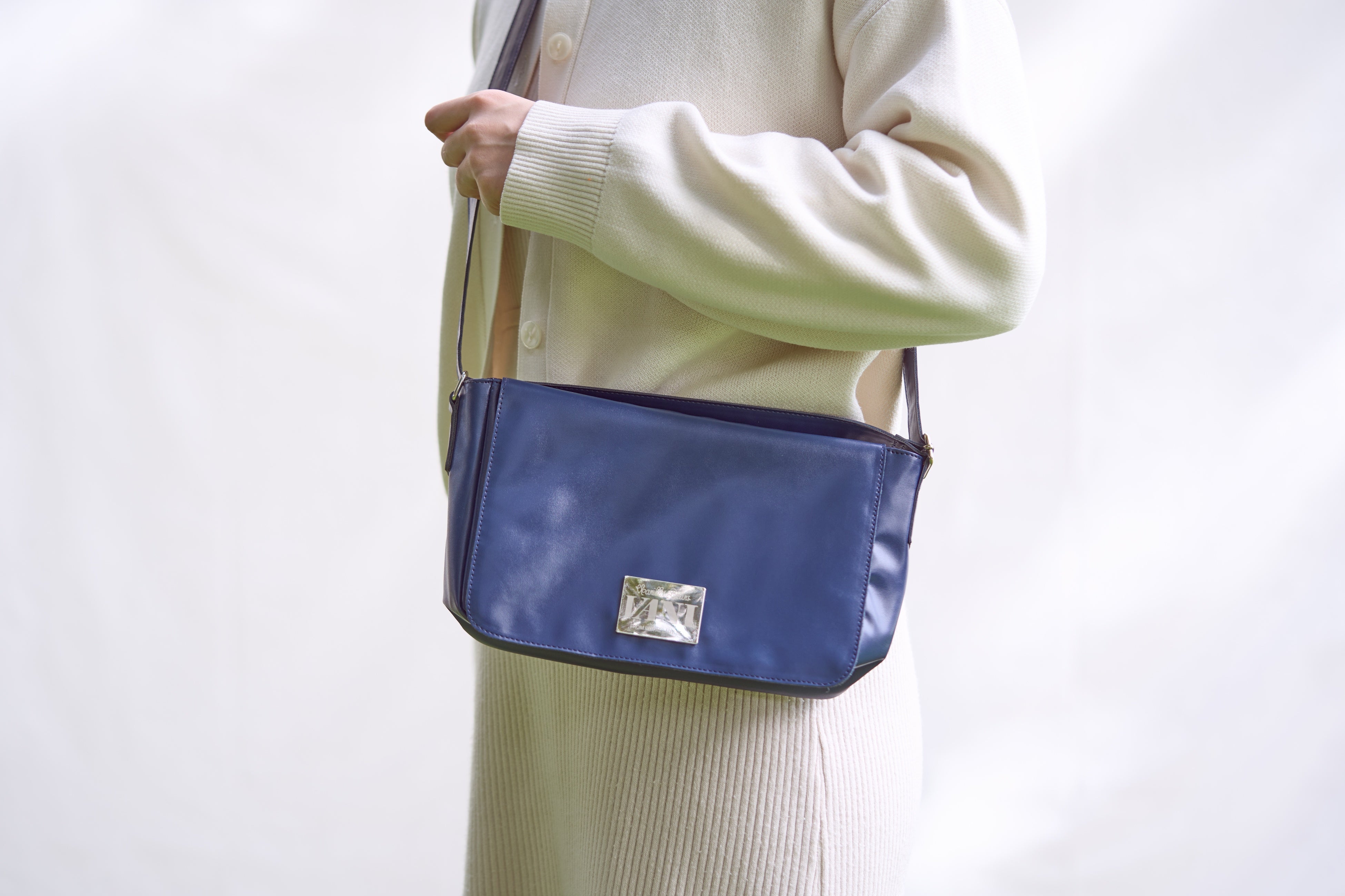 VANIカラーの青にシルバーのロゴが入ったシンプルなデザインで、肩掛けができる使いやすい仕様でご用意いたしました。