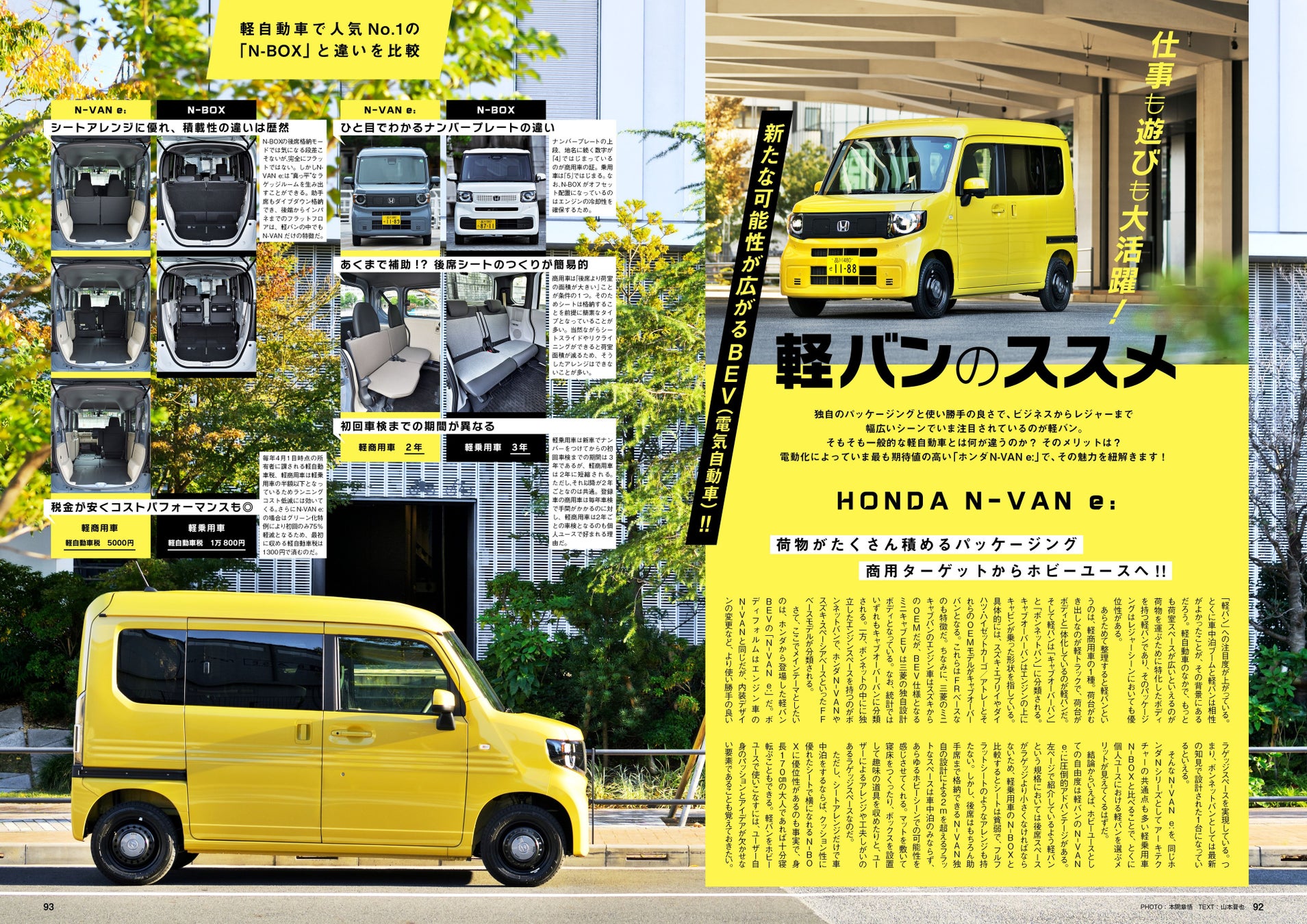 軽バンというと「仕事で使うクルマ」というイメージを持つ人が多いと思うが、近年のアウトドアブームもあり、「趣味クルマ」として使う人が増えてきた。大容量空間とBEVのイイトコ取りの軽バン「N-VAN e:」と、軽乗用車ナンバーワンのN-BOXとの違いを比較。また、キャブオーバー乗用モデルの人気車「エブリイワゴン」の使い勝手も紹介。