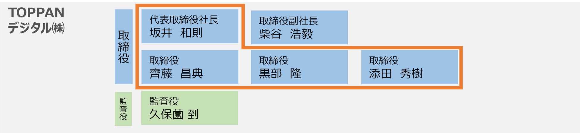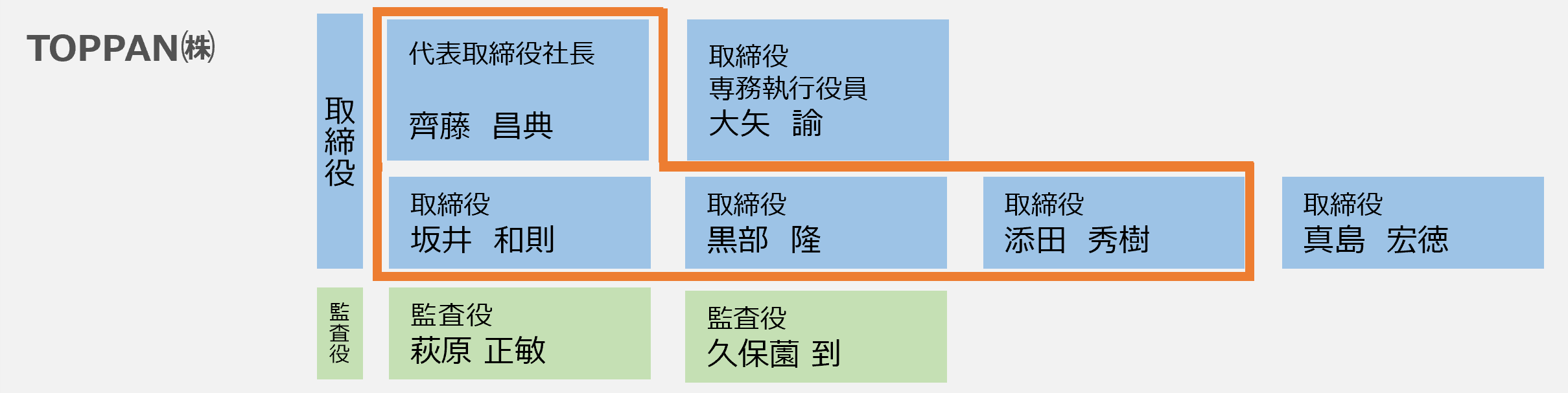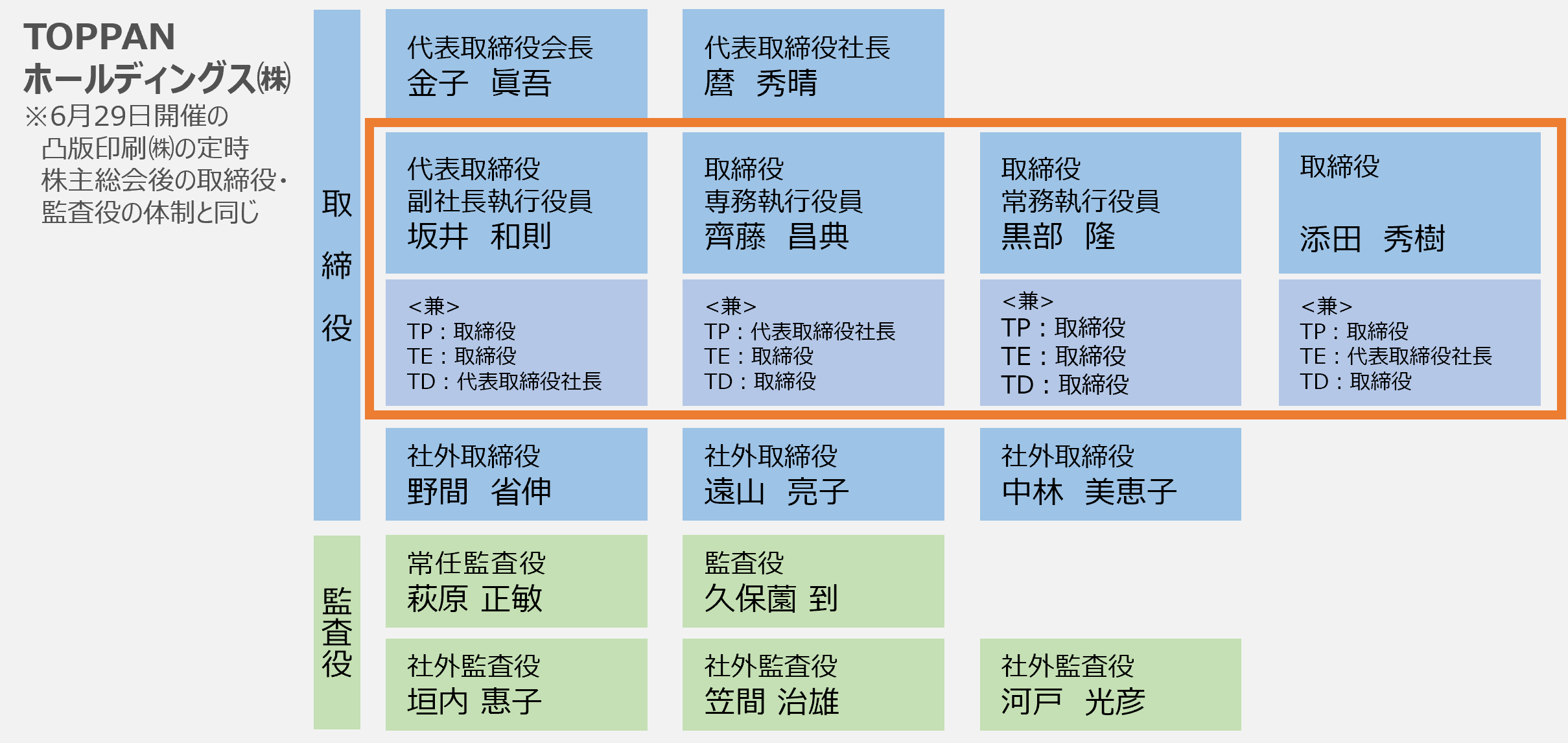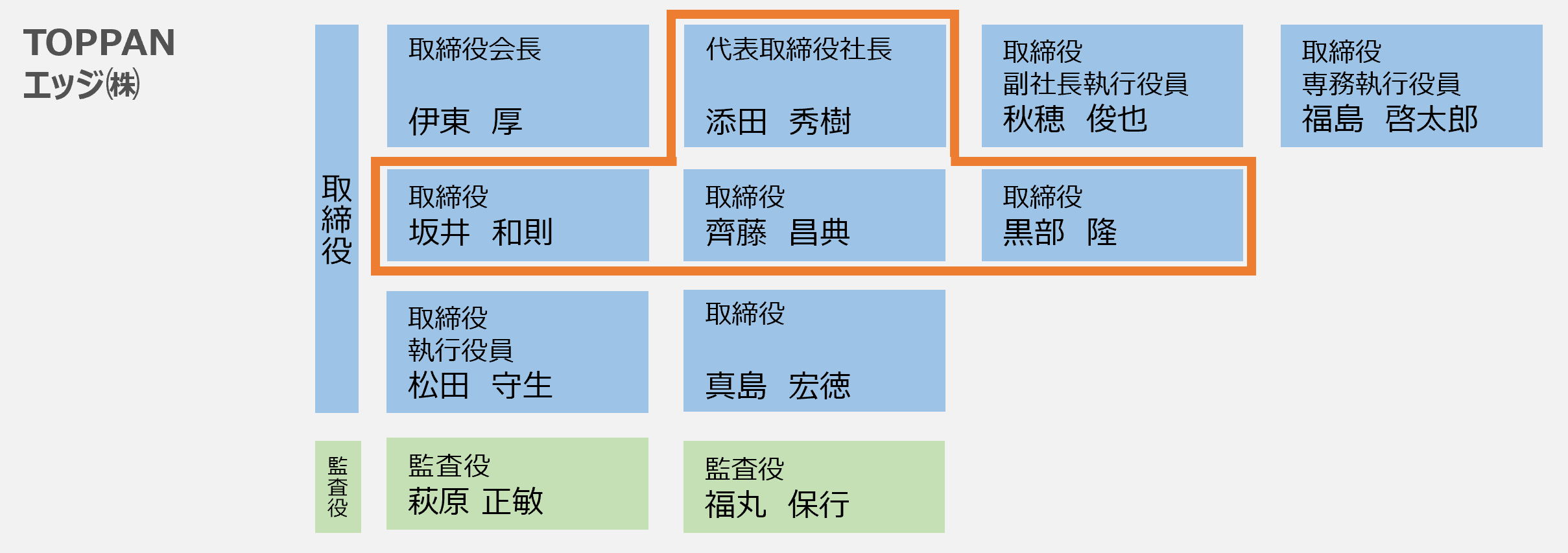 また、持株会社体制へ移行後は、グループ会社間の連携を一層深め、これまで以上にグループ視点で経営を行っていくことに加え、意志決定の迅速化も進めていきます。そのために、持株会社の取締役がTOPPAN株式会社、TOPPANエッジ株式会社、TOPPANデジタル株式会社の取締役を兼務し、一体となって経営を遂行する体制としました。