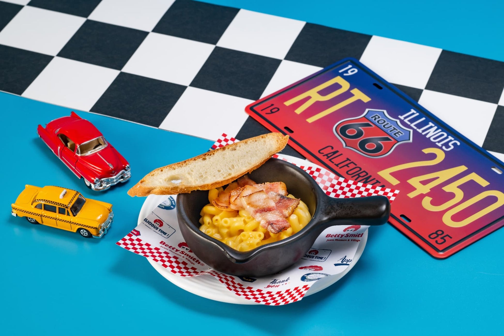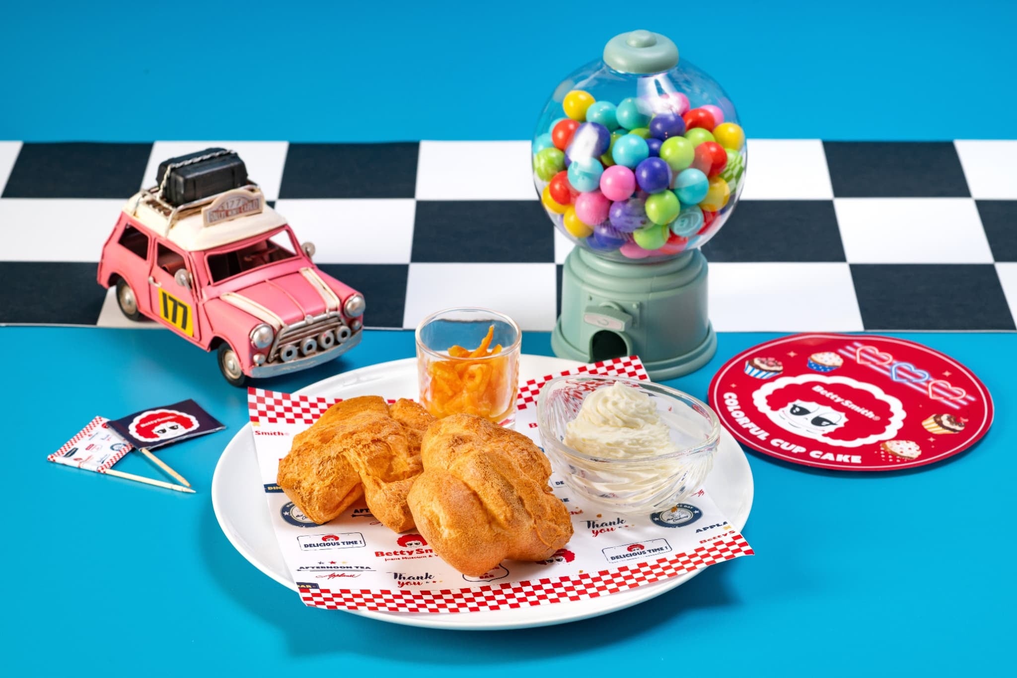 一歩足を踏み入れた瞬間から、そこはアメリカンポップのカラフルな世界!店内は、思わずカメラを向けたくなるようなキュートな装飾で彩られ、SNS映えもバッチリです。今回は特別に、岡山を代表するジーンズメーカー「ベティスミス」様に装飾協力いただき、その世界観をさらに盛り上げます。