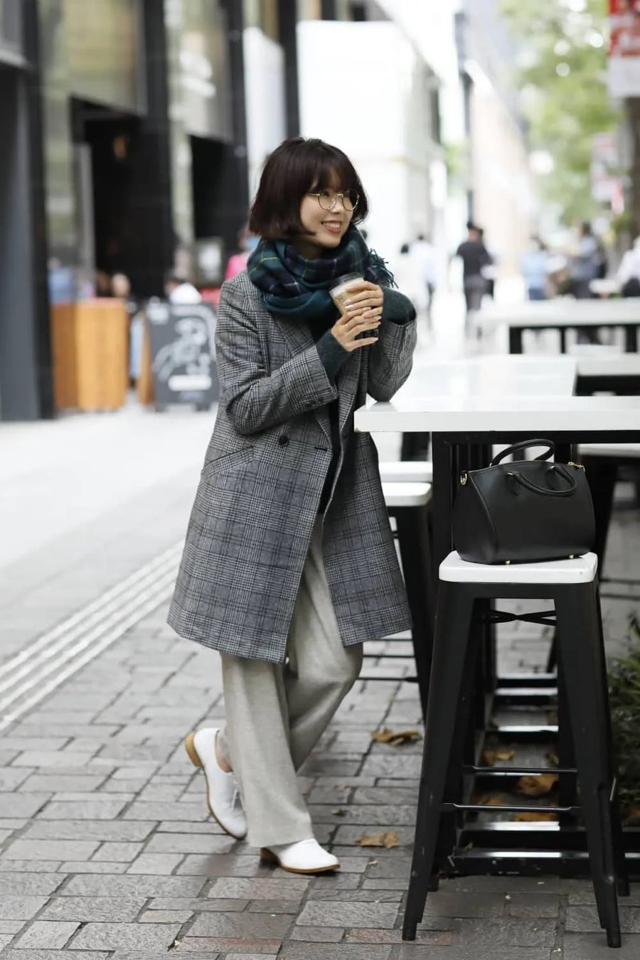 トラディショナルな面持ちのグレンチェック柄は、通勤スタイルもシックに演出。チェック柄に使われているパープルのラインを拾って、スカートをセレクトしました。トップスは、端正な白シャツをブラックのタートルネックニットにレイヤードし、コントラストのある着こなしに。重ね着を楽しめるのもこの季節の醍醐味です。