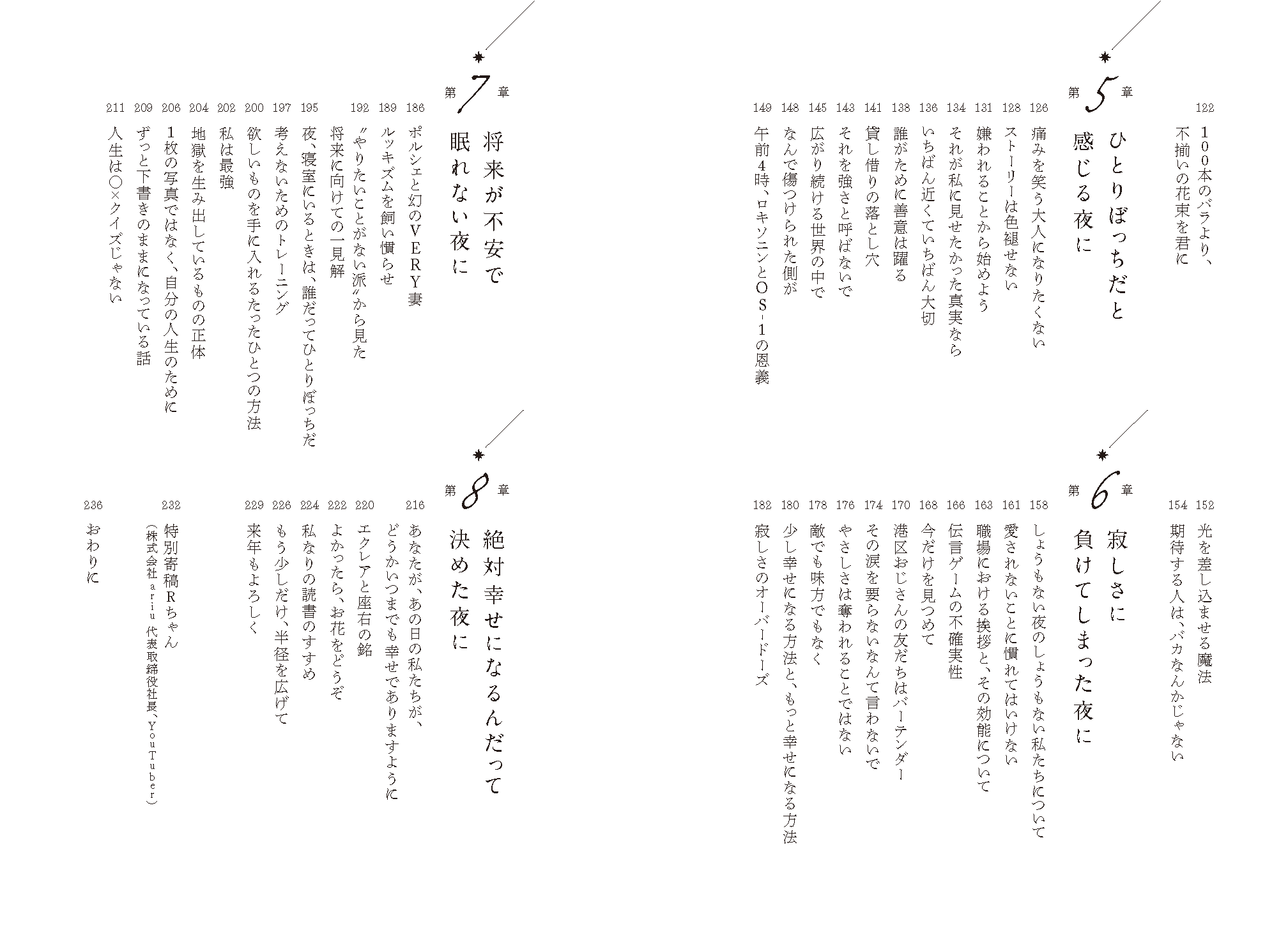 失恋した、悪口を言われた、自分が嫌いだった、あの子がうらやましくなった――ひとりだった。六本木ナンバーワンのキャバ嬢のメンタルを支える源とは? そして、女性が強く生きていくために必要な心構えとは? ひとりぼっちの夜を乗り越える珠玉の言葉たち。