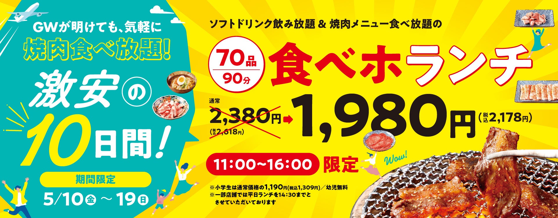 ◆対象商品・価格:ランチタイム限定の焼肉メニュー+ソフトドリンクバーの70品90分食べ飲み放題プランがおひとり様1,980円(税込2,178円)