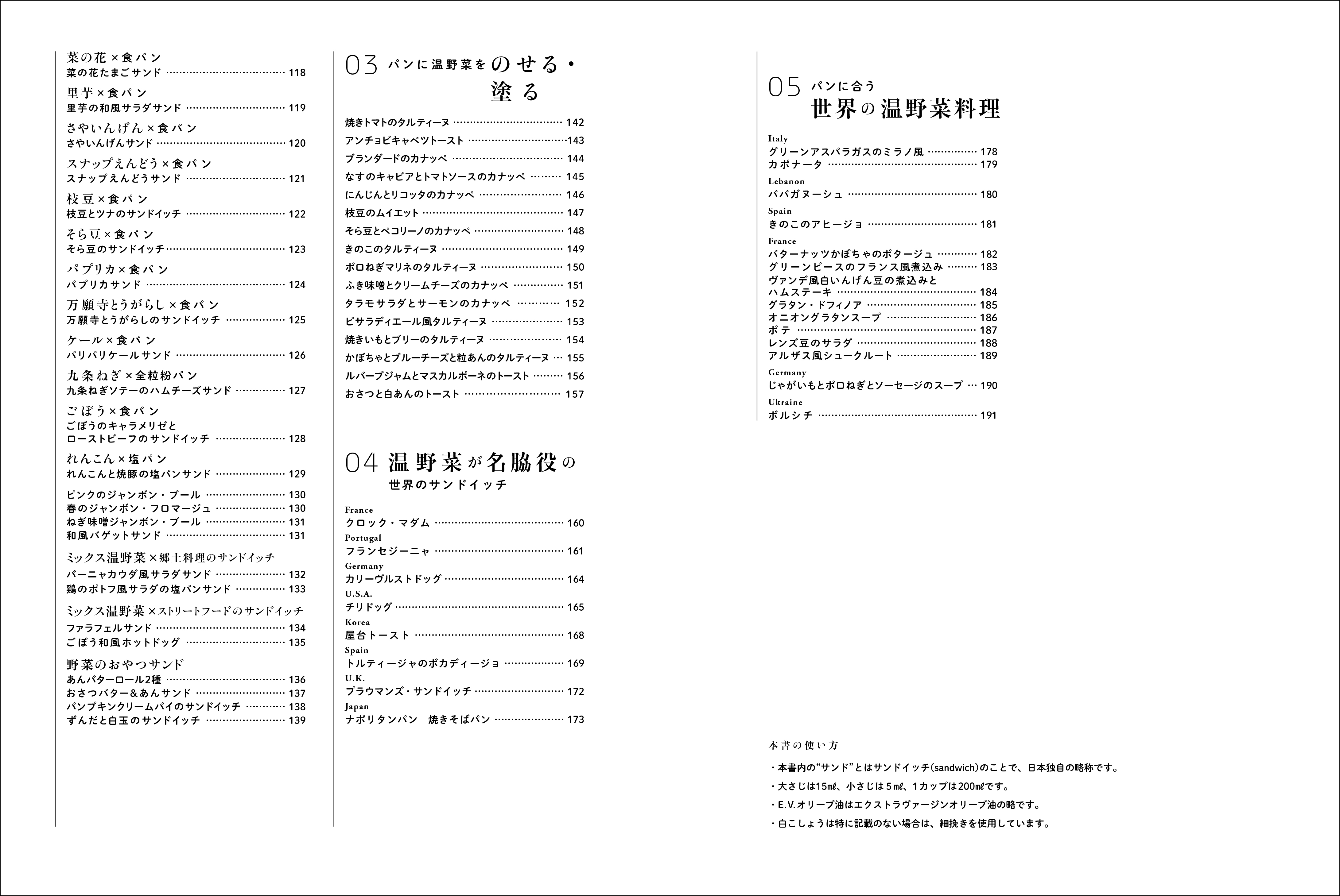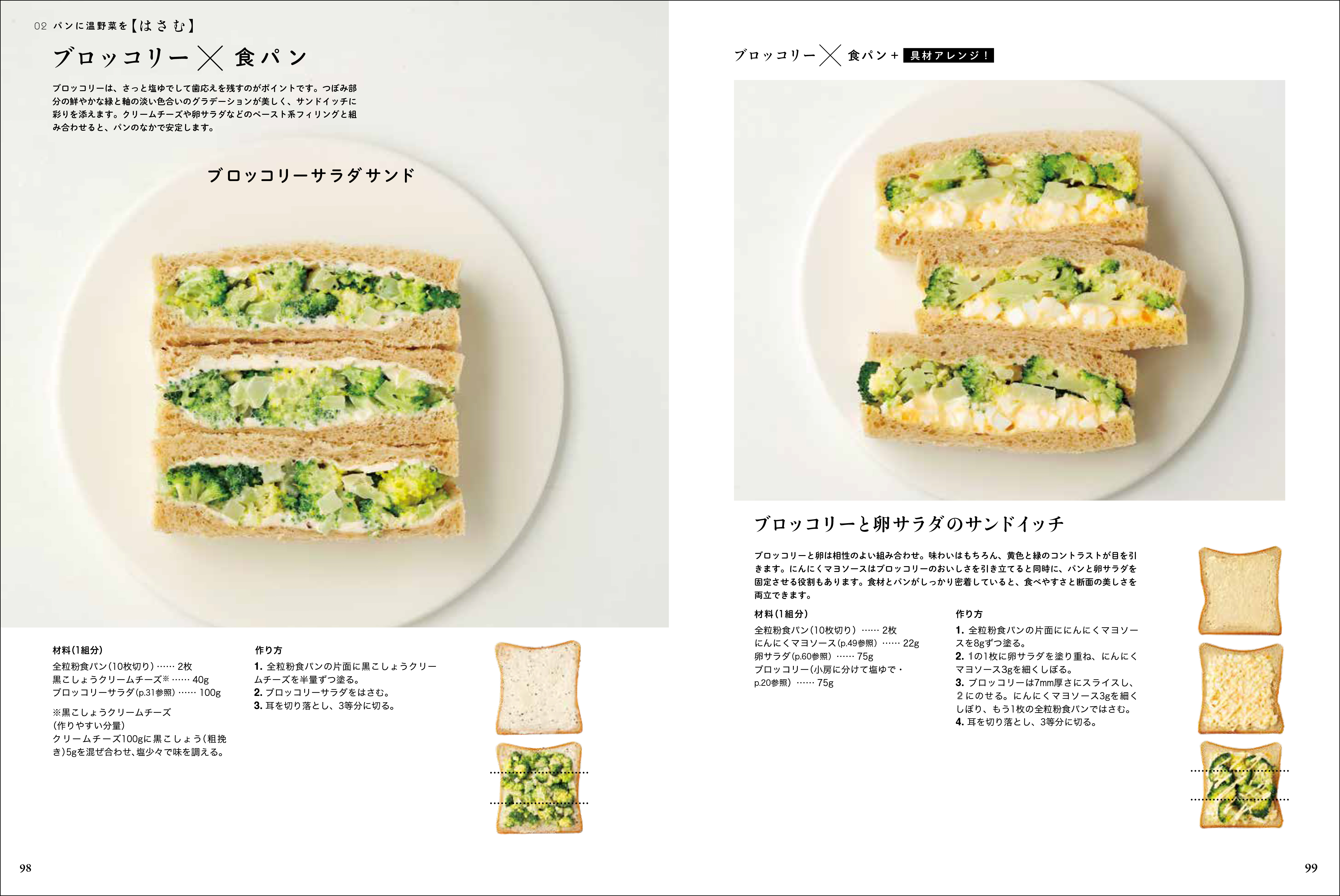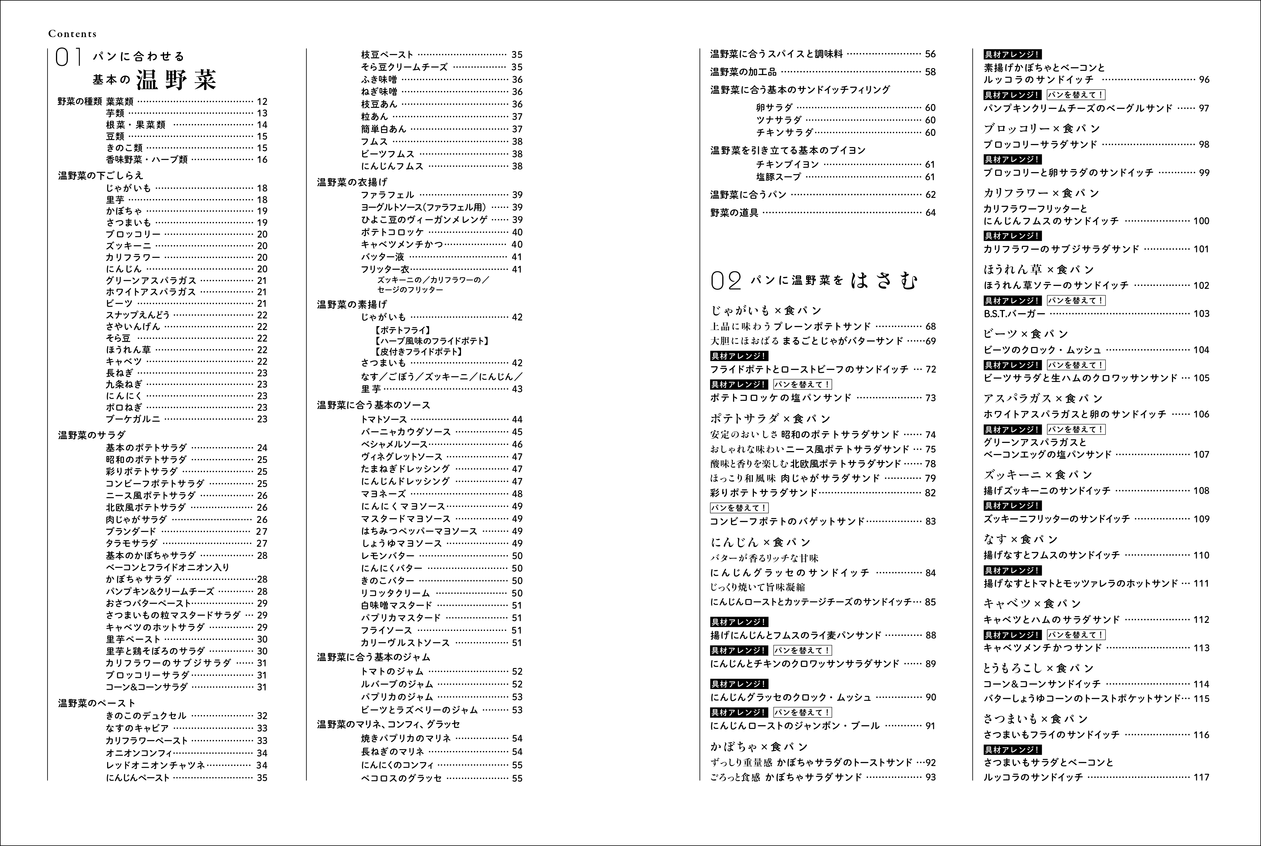ゆでる、蒸す、焼く、揚げる…などの加熱方法の基本、加熱調理による味わいの変化などから、温野菜に合う基本のソースの作り方(ベシャメルソース、オイル系ソースほか)、温野菜に合う市販の調味料、スパイスの知識、加熱野菜のサンドイッチ用ペーストの作り方(トマトソース、オニオンコンフィ、フムス、マッシュルームペーストほか)、単品野菜でシンプルなサンドイッチの組み立て方、相性のよい複数野菜のミックス野菜サンドイッチ、さらにタルティーヌの基本と応用、パンに合う野菜のスープと煮込みなども解説し、定番のサンドイッチに「温野菜」をプラスすることで広がる新しいおいしさも提案します。