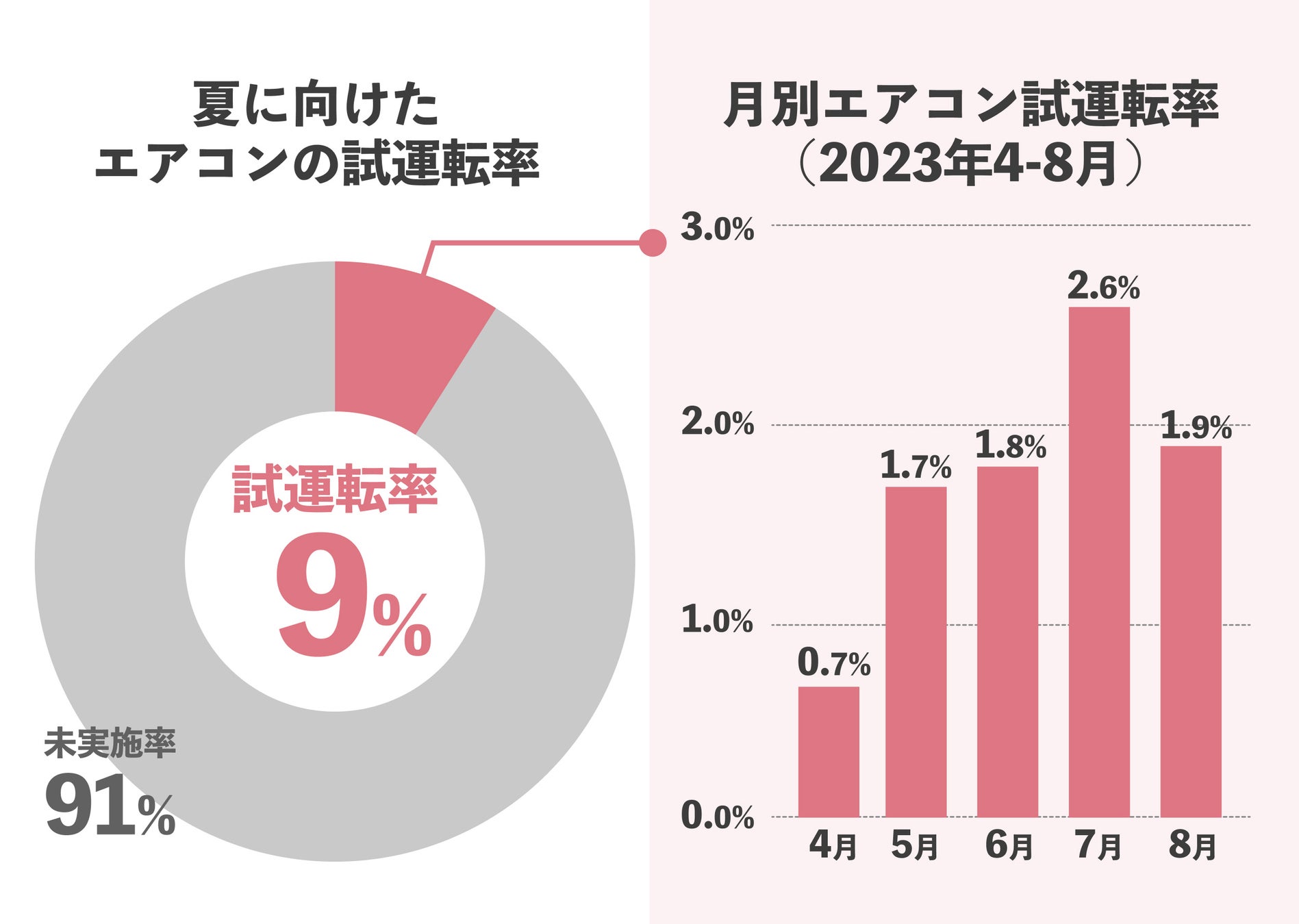 その結果、エアコンの試運転率は気温の上昇に伴い4月から6月にかけて上昇し、7月にピークを迎えますが、調査対象のエアコン全体のうち約9%しか実施されていないことが分かりました。