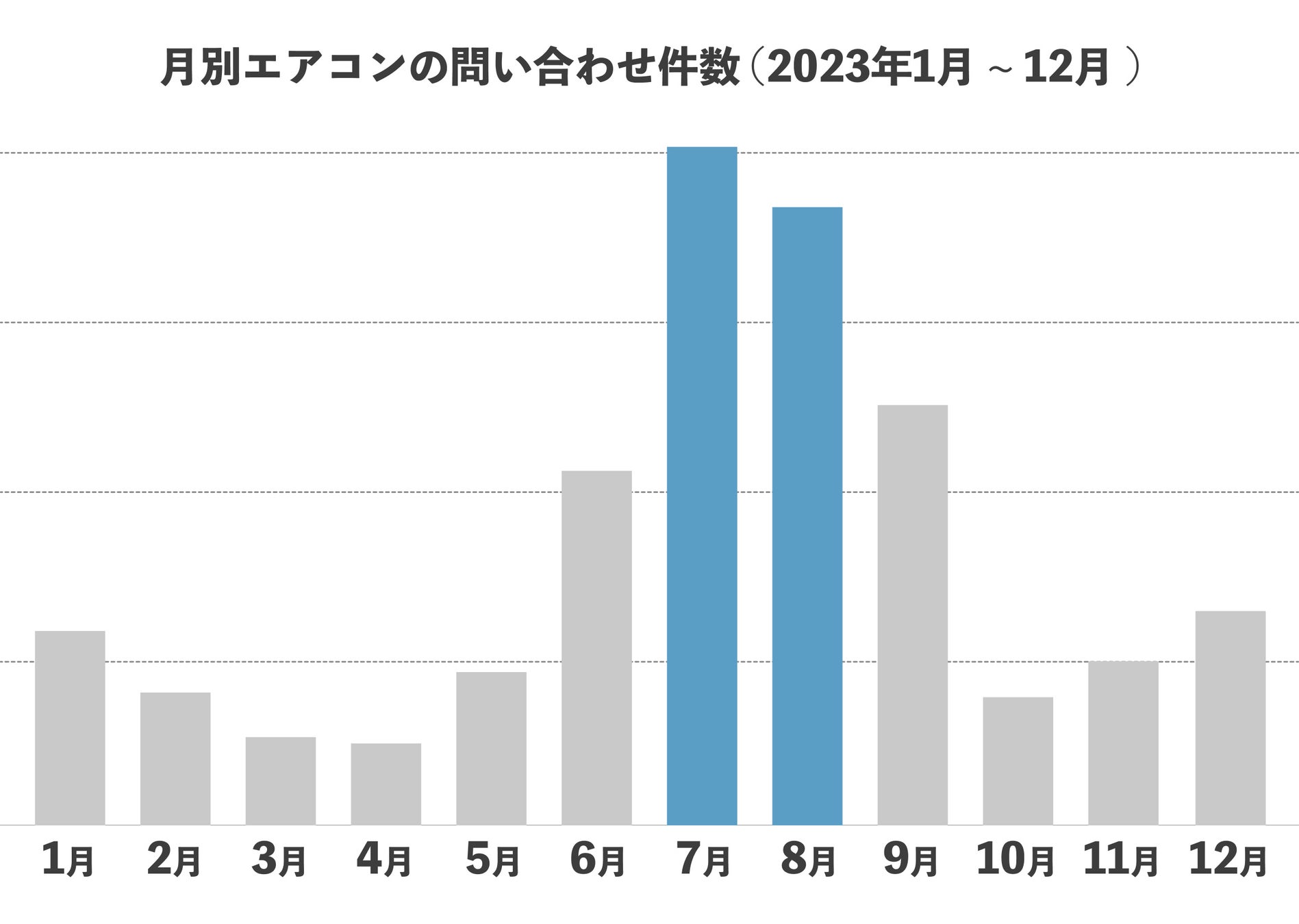 また、2023年の月別のエアコンに関する当社へのお問い合わせ件数についても調査したところ、試運転率の伸びと同様に、お問い合わせ件数も7月にピークを迎えました。例年、気温のピークに合わせてエアコンに関する問い合わせも増加しますので、修理対応などでお待たせしてしまうことも起こりえます。