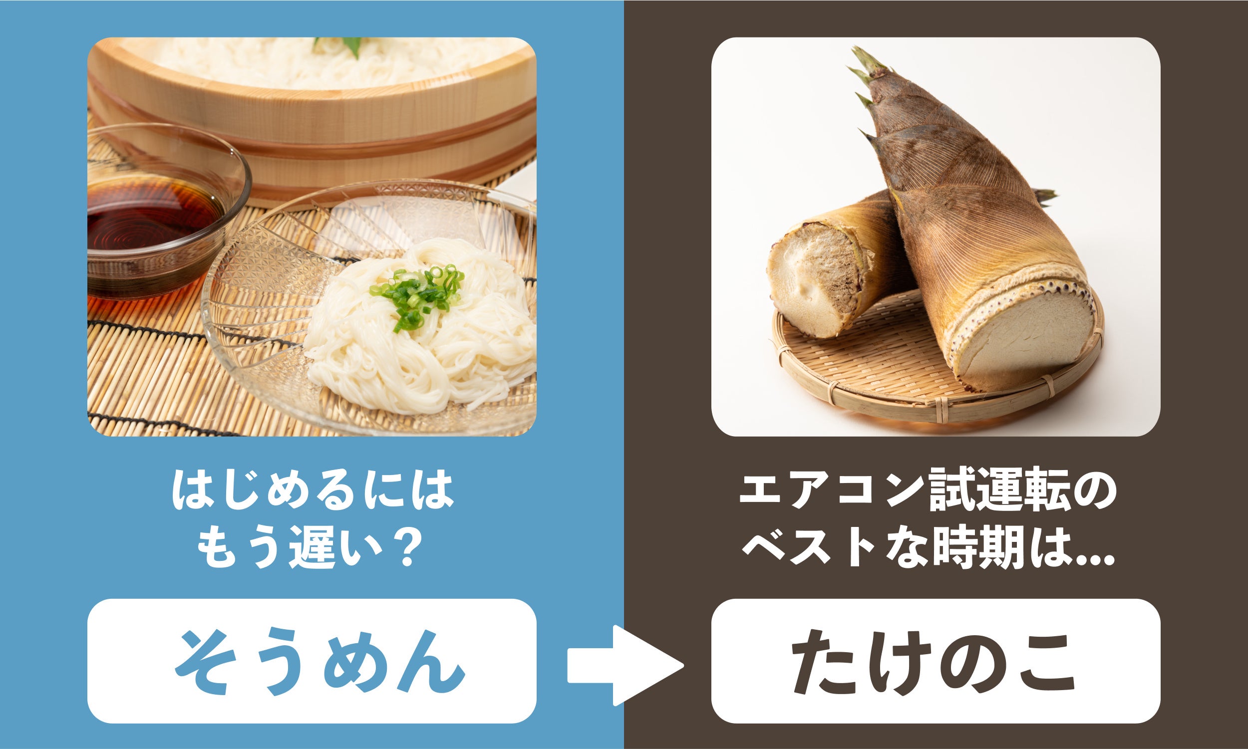 現在、【そうめん】の時期にエアコンの故障に関する検索が増えることからも、【たけのこ】をよく見かけるようになったら、エアコンの試運転を実施いただくことを推奨します。