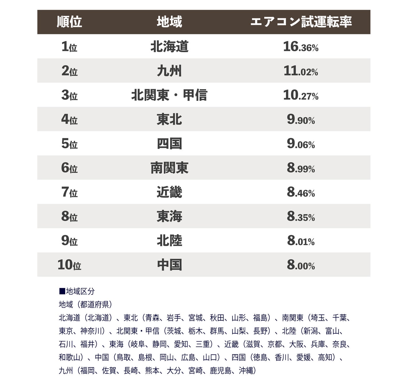 さらに、地域別で比較すると、最も高かった北海道地方(16.36%)と最も低かった中国地方(8.00%)では、エアコン試運転率に2倍以上の差がありました。