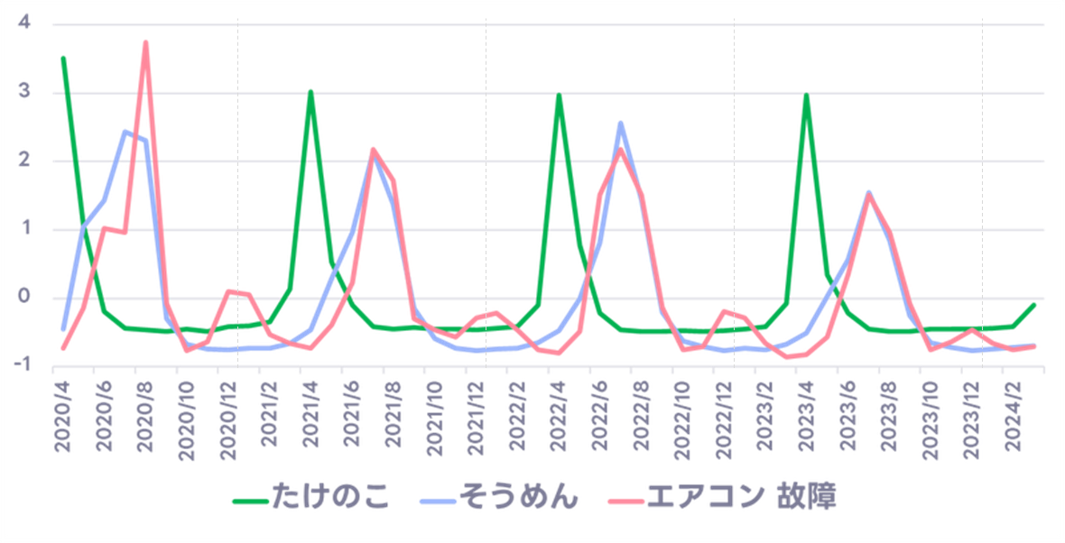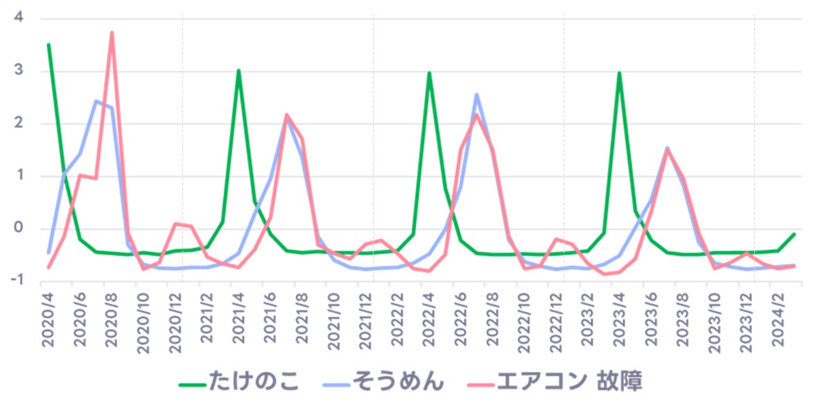 出典:DS.INSIGHT【エアコン 故障】【そうめん】【たけのこ】の検索推移(2020/4〜2024/3)