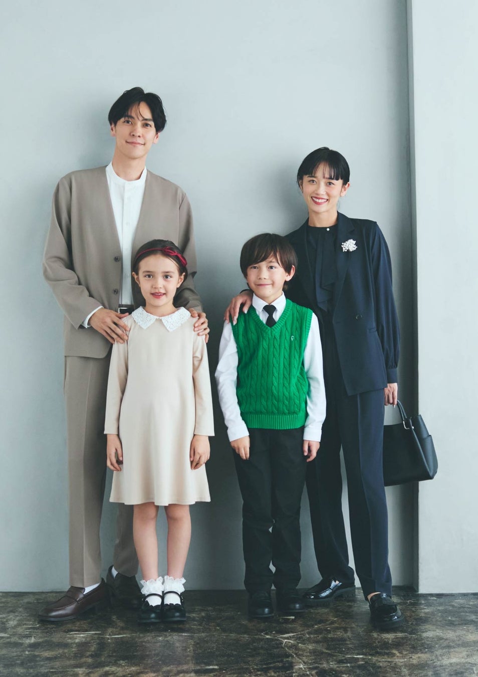 ノーブルな濃紺〜黒で揃えることで、品よくチーム感アップ! 娘のセットドレスのグレンチェック柄や、ママのツイードジャケットなど、柄や素材で奥行き感を。息子のノーカラージャケットは、実は同じデザインで大人サイズもあり。パパとお揃いしてみても!