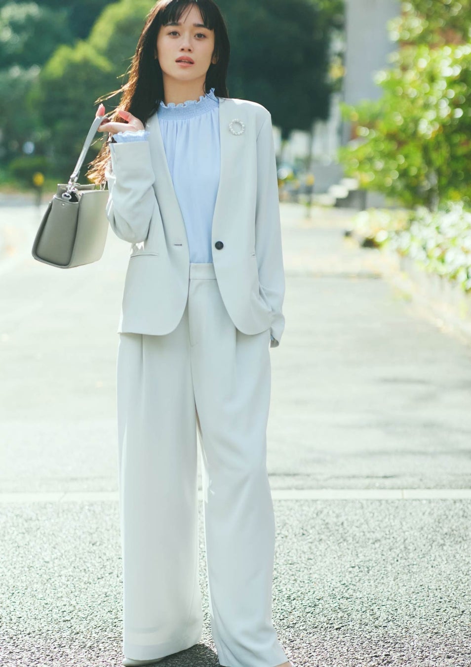 セレモニー服の鉄板だからこそ差をつけたいジャケットルック。絶妙な色出しのライトグレー、ゆとりのあるサイジングなら、セットアップでも気張らず、春めくような佇まいに。可憐なシャーリングブラウスも寒色ベースで甘すぎず。式の後は仕事、というマルチタスクなママにもおすすめ。