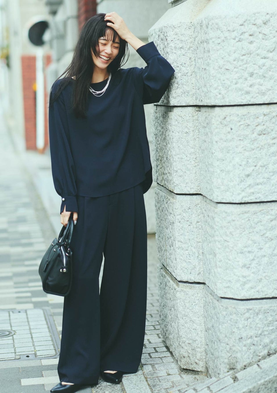 ボディラインを拾わないゆるやかなシルエットで、更新感のあるフォーマルスタイルに。ブラウスのパール使いのカフスや、ワイドパンツのほどよいドレープ感など、上質なディテールでエレガントな印象づけを。同素材だからこそ安心のあるカセット服は、基本のワードロープとして持っておきたい。