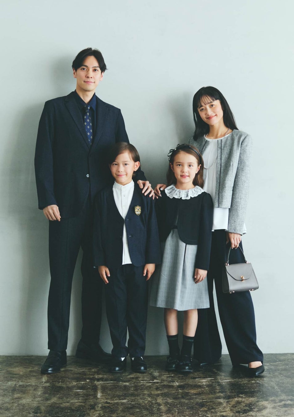 卒入式にふさわしい、家族全員ジャケットコーデでハレの日らしく。ママ×娘はホワイトのツイードジャケット、パパ×息子はネクタイ合わせのネイビースーツ。どこかリンクをさせたアイテム選びが、とびきり素敵なバランスを生み出す秘訣。