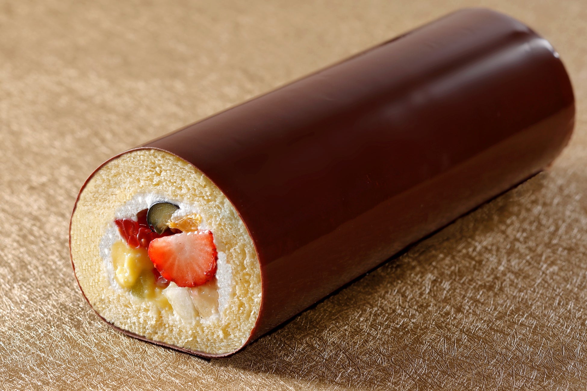 七福神にちなみ、7種類のフルーツを入れたロールケーキを海苔に見立てたチョコレートで巻きました。