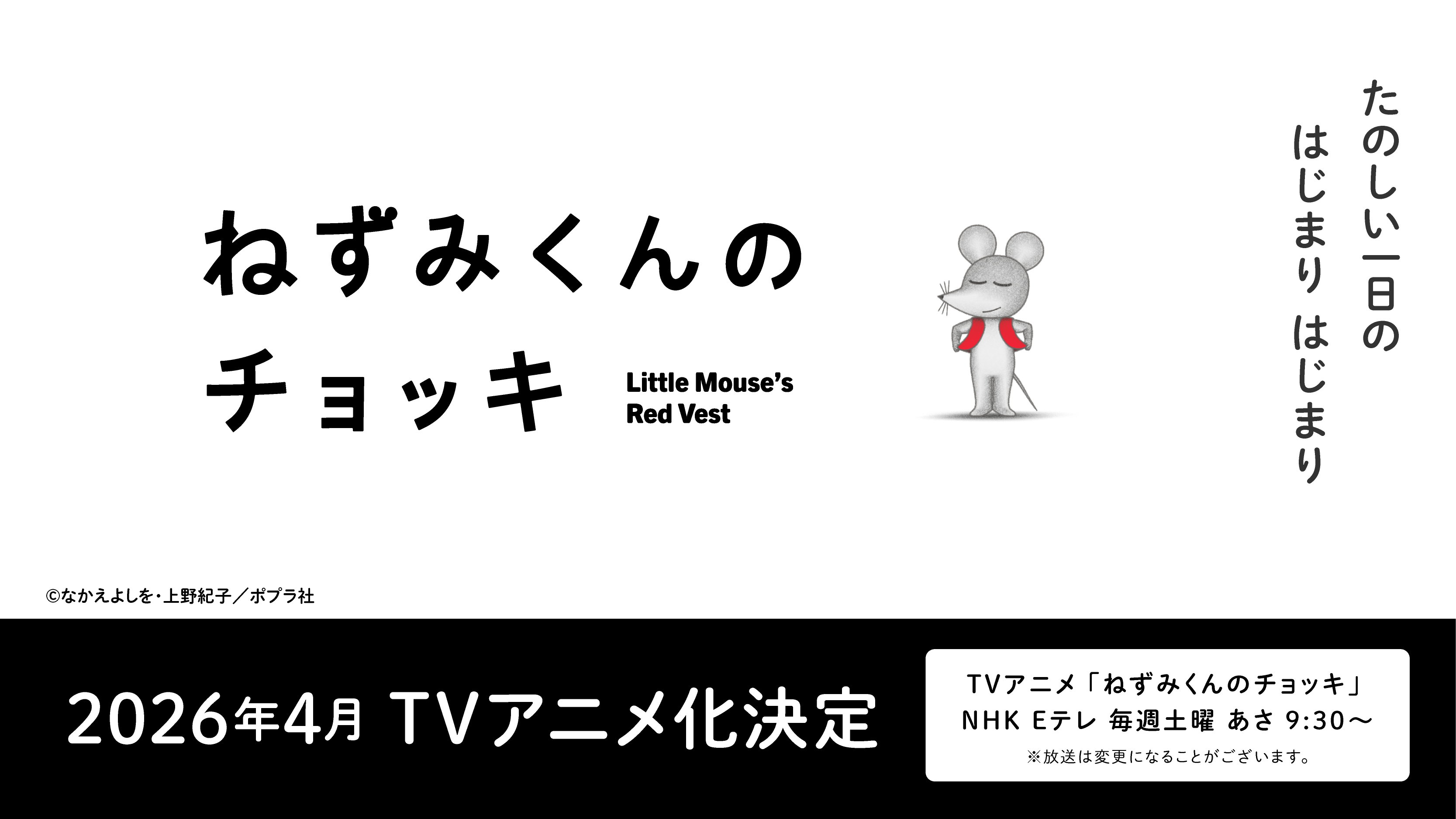 株式会社ポプラ社より1974年に刊行された「ねずみくんの絵本」シリーズ(著者:なかえよしを/作 上野紀子/絵)。TVアニメが、4月より放送されることが決定いたしました。