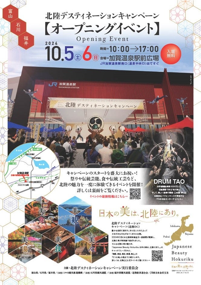 北陸3県(富山県、石川県、福井県)・北陸経済連合会とJR6社が連携して10月から開催する北陸デスティネーションキャンペーンの幕開けを飾るオープニングイベントを、下記のとおり開催します。