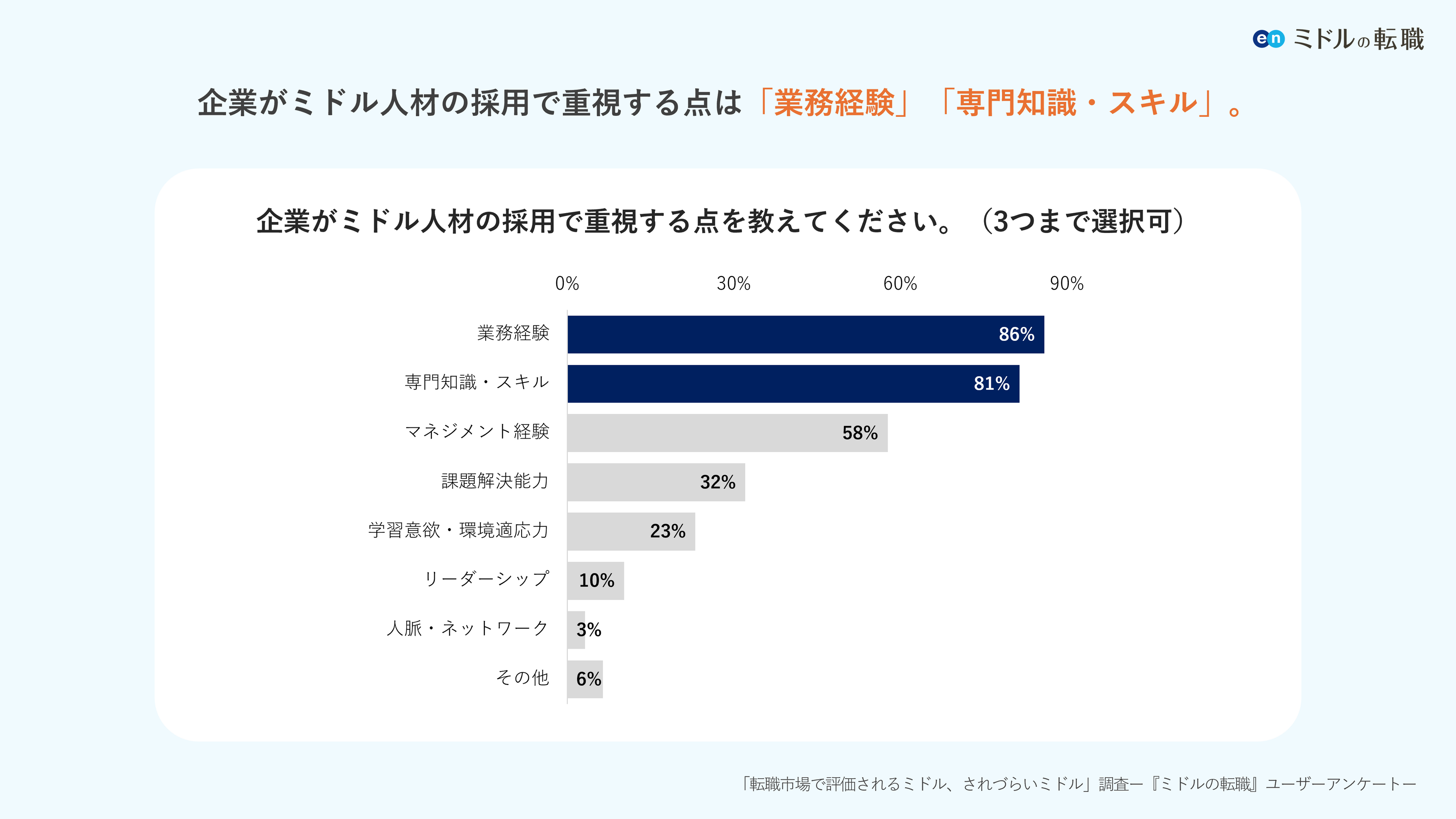 企業がミドル人材の採用で重視する点を伺うと、上位は「業務経験」(86%)、「専門知識・スキル」(81%)でした。理由や具体的なエピソードも伺うと、「実務に沿った経験があれば年齢の要件も緩和するケースもある」といった回答が寄せられました。